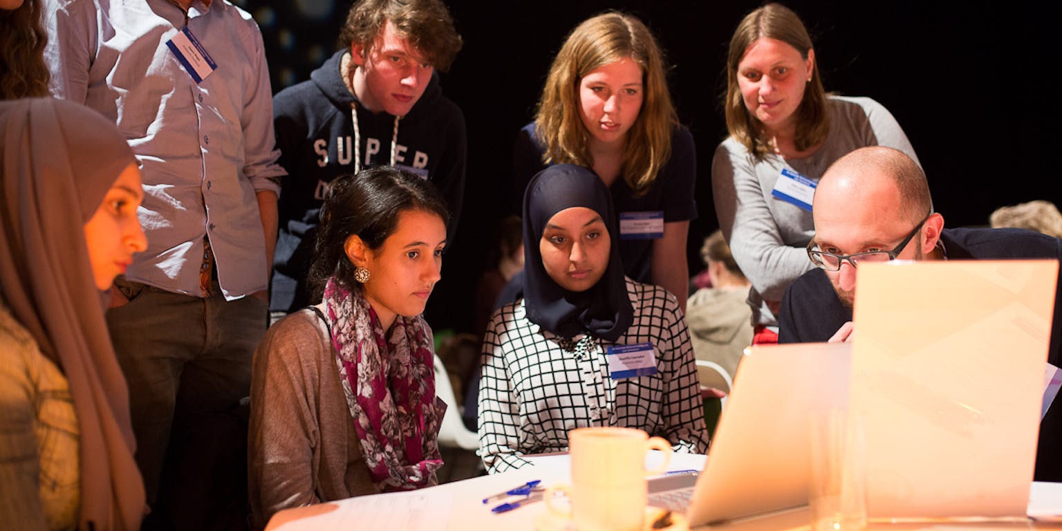 Scholieren met elkaar in discussie over de beste wetenschappelijke vraag. Op de voorgrond de tafel der natuurwetenschappen.