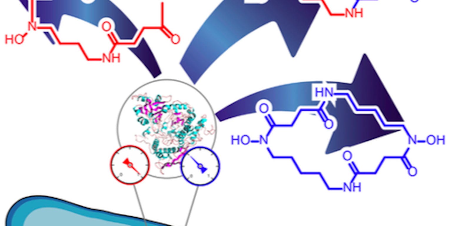 S. algae produceert drie van deze ringvormige sideroforen: putrebactine, avaroferrine en bisucaberine in de verhouding 1:2:1. Avaroferrine is een mengvorm van de andere twee. Uit twee basisbouwstenen weet S. algae dus drie verschillende sideroforen te maken. Böttcher vroeg zich af hoe de bacterie dat doet en welke factoren de productieverhouding bepalen. In Cell Chemical Biology beschrijven hij en collega’s nu dat slechts één enzym, AvbD, verantwoordelijk is voor de biosynthese van alle drie de sideroforen. Dat is opvallend, omdat we in alle biochemieboeken lezen dat enzymen zo bijzonder zijn vanwege hun hoge specificiteit. Ze katalyseren één reactie en doen dat heel erg goed. Maar AvbD katalyseert er dus drie.