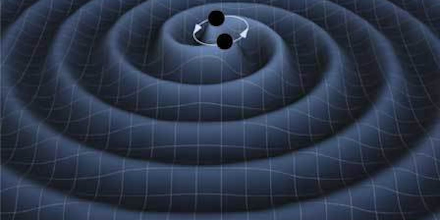 Het heelal van Einstein is niet netjes vlak, maar gegolfd. De aanwezigheid van zware voorwerpen zorgt voor een vervorming in ruimte en tijd. Illustratie: Testing Einstein’s Universe / Norbert Bartel