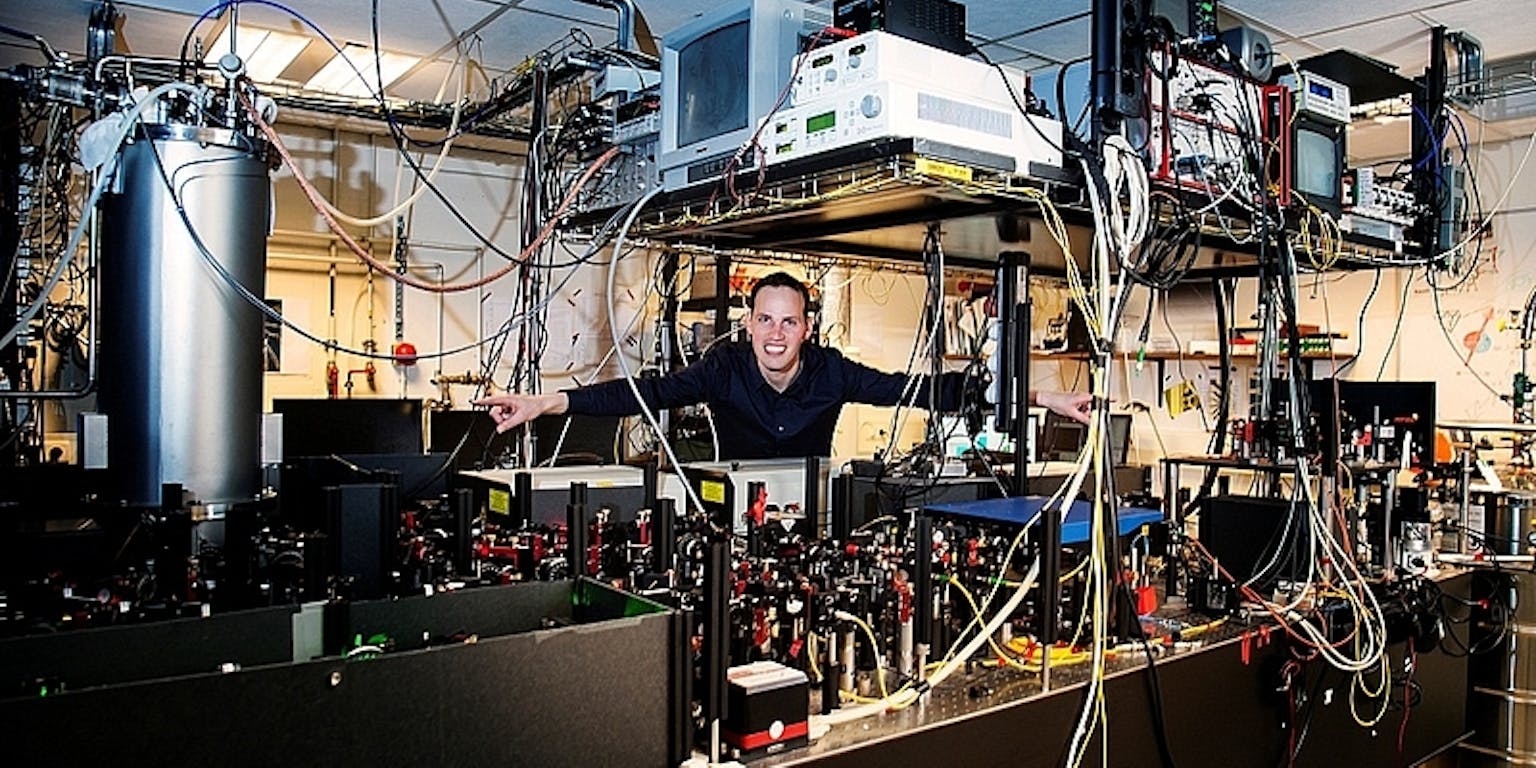 “Maar het kan natuurlijk ook zo zijn dat je in de toekomst meerdere quantumcomputers hebt die je wilt laten samenwerken”, gaat hij verder. “Met deze experimenten willen we laten zien dat ze via een verstrengeling met elkaar kunnen communiceren. Ze kunnen dan als één computer berekeningen uitvoeren. De basis van dit proces hopen we nu eerst aan te tonen over een afstand van drie meter, maar dat zou uiteindelijk ook net zo goed over honderden of duizenden kilometers moeten lukken.”