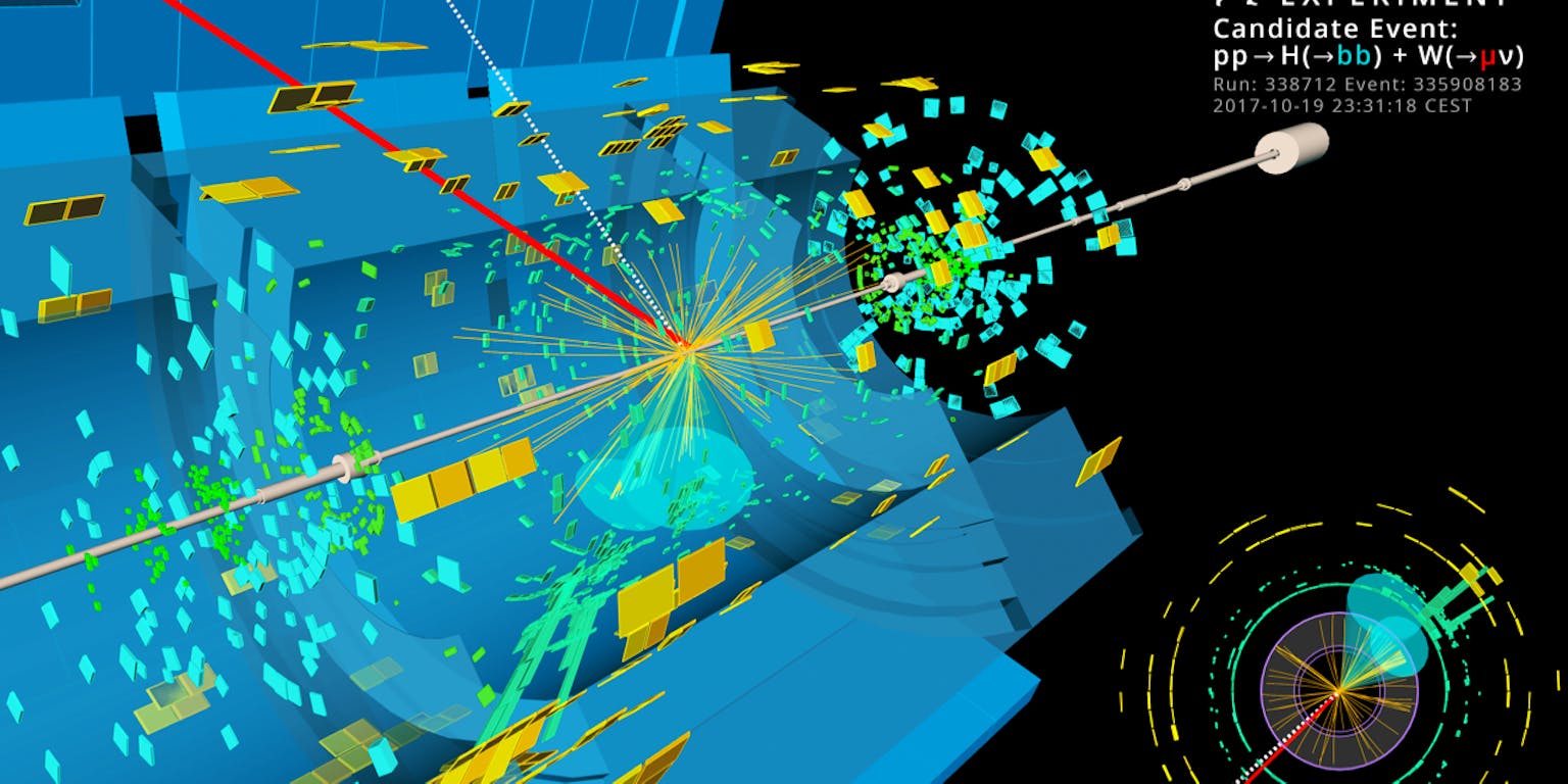 Weergave van het verval van Higgsdeeltje in twee bottomquarks in de ATLAS-detector. Tegelijkertijd is er een zogenoemd W-boson gecreëerd dat vervalt in een muon en neutrino.