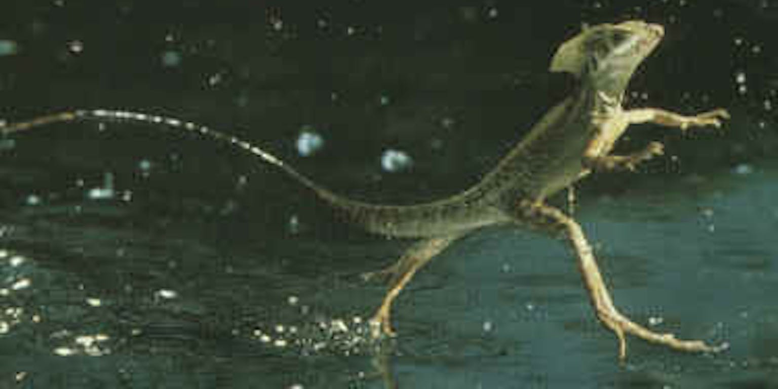Een van de meest spectaculaire waterlopers is de basiliskhagedis. Dit beestje gebruikt zijn achterpoten om over het water te rennen op jacht naar prooi of om zelf aan achtervolgers te ontkomen. De jongeren lijken er haast overheen te vliegen, de oudere, zwaardere dieren weten zich in continue worsteling aan het water te ontrukken. Deze bijzondere hagedis kreeg vanwege zijn aquatisch loopvermogen de bijnaam ‘Jezushagedis’ ( Jezus Christ Lizard). Als de mens ooit zou willen lopen, zou hij het van dit wonderbaarlijke beestje moeten afkijken.