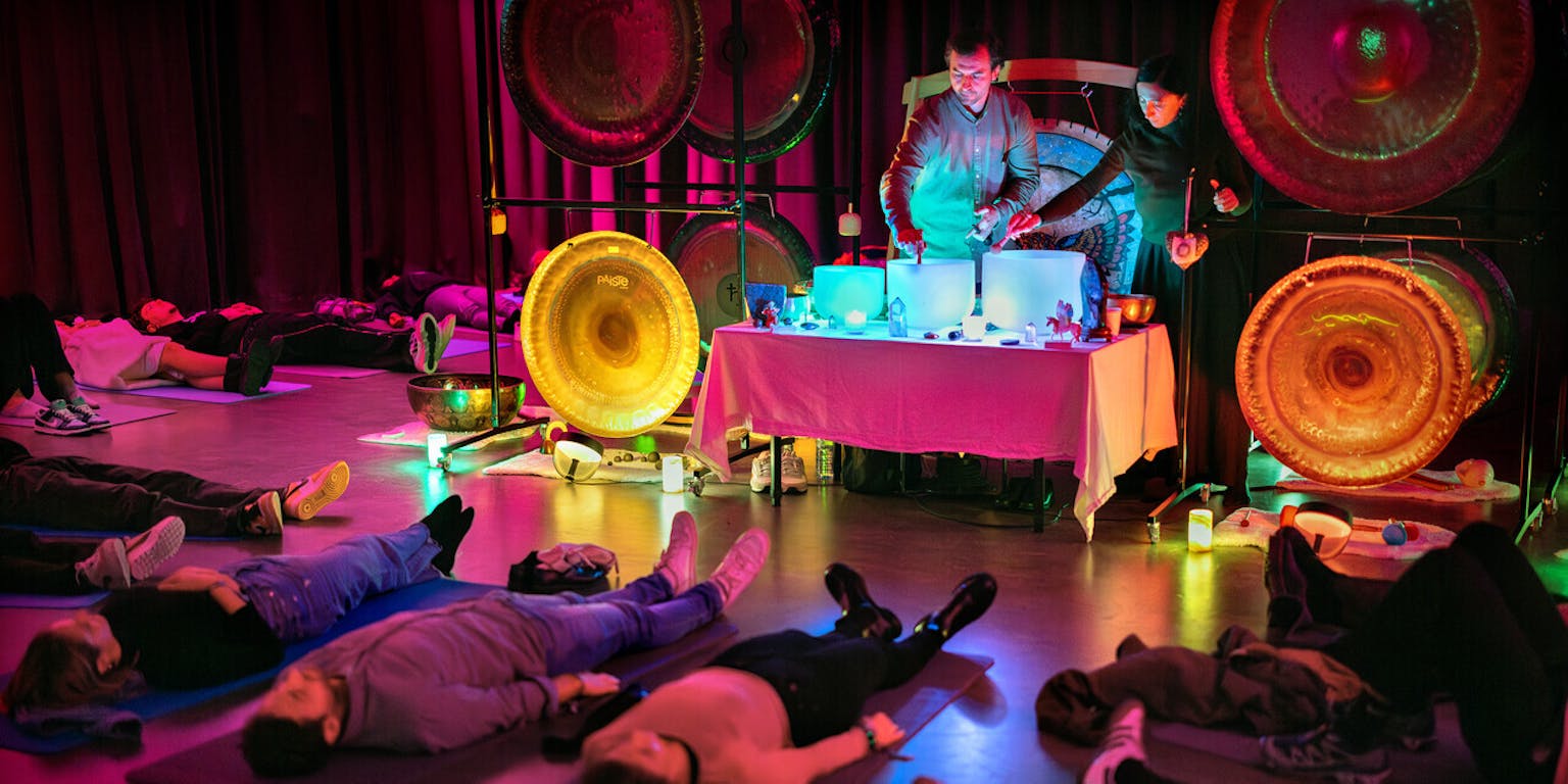 Het soundbath wordt verzorgd door Iulian en Nicoleta van Cosmic Sound. Tijdens Museumnacht 2023 gaven zij drukbezochte soundbaths in NEMO Science Museum, om het publiek als herboren de nacht weer in te laten stappen.