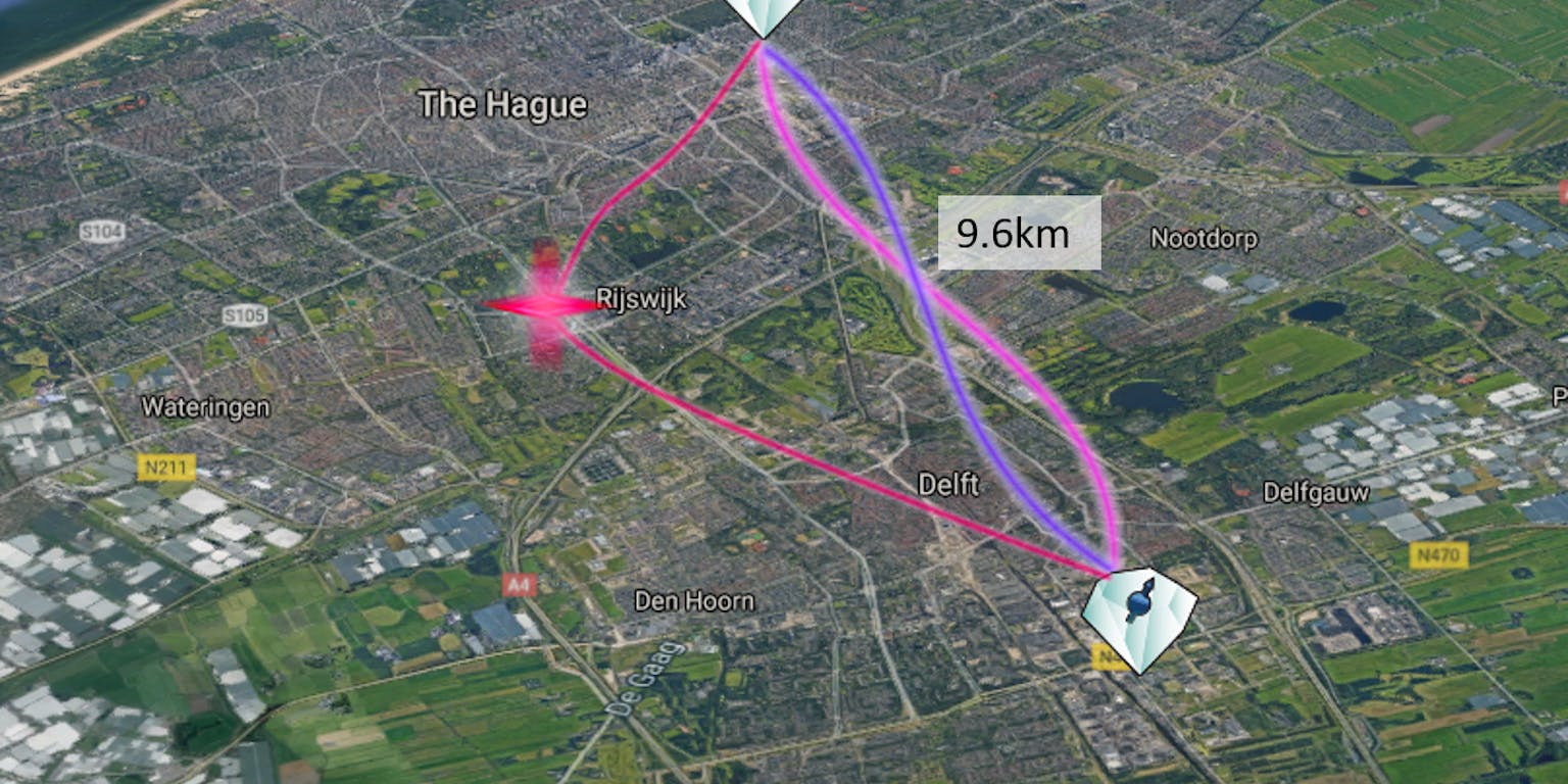Een satellietfoto van Den Haag en Delft, met de afstand waarover we verstrengeling willen maken.