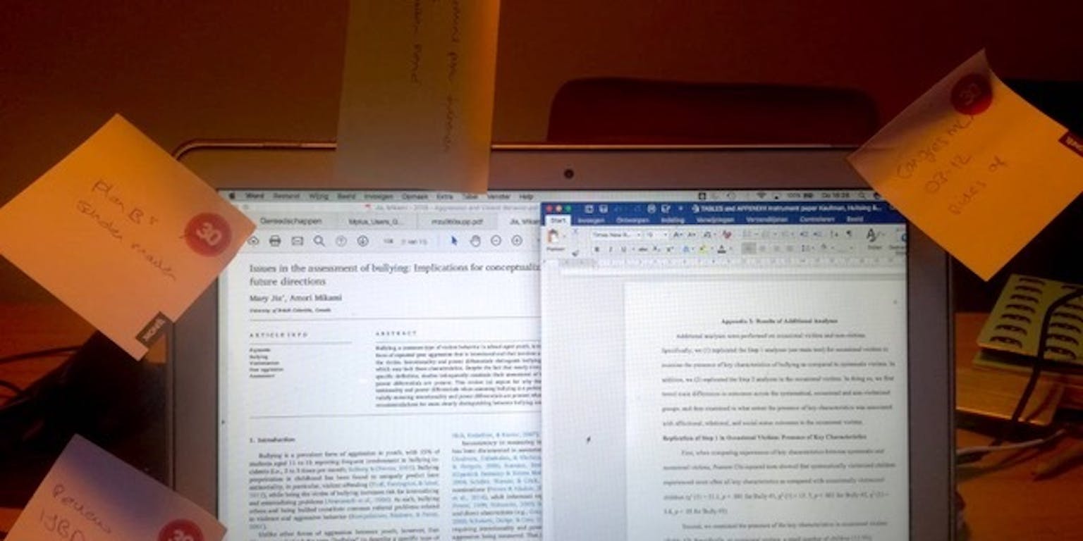Tot laat doorwerken aan je proefschrift, met een heleboel memo’s als geheugensteun.