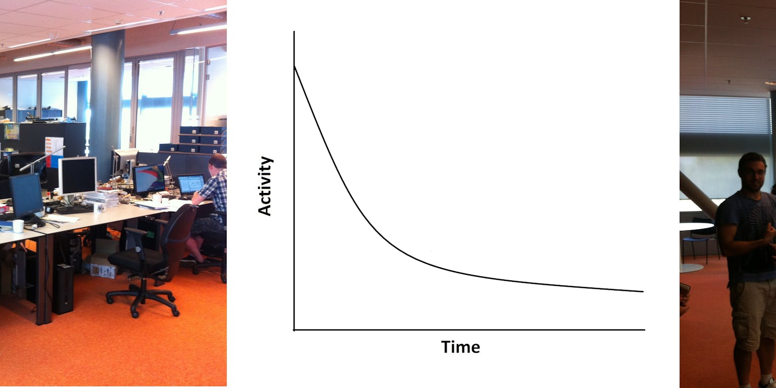 Door te kiezen voor flex werkplekken in een open office area kunnen enorm veel mensen tegelijk werken waardoor je initieel een heel hoge activiteit hebt. Op den duur zullen die mensen echter afgeleid worden door elkaar. De onderlinge afstand tussen de mensen is namelijk erg klein en er is geen fysieke barrière die ze uit elkaar houdt. Na verloop van tijd zullen de mensen dus samenklitten wat leidt tot een verlies aan activiteit.