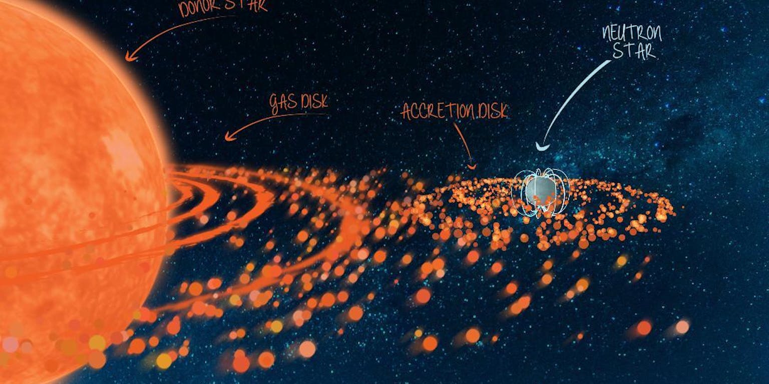 Zet zo’n neutronenster in een baan rond een ‘normale’ ster, zoals onze zon, en met zijn enorme zwaartekracht zal hij zijn buur-ster opeten: de buitenste gaslagen van de normale ster stromen door de tussenliggende, lege ruimte naar de neutronenster. En omdat de kannibalistische neutronenster zo extreem is in al zijn eigenschappen, creëert dit een experiment waar een aards laboratorium slechts van kan dromen: hier kunnen we bijvoorbeeld bestuderen wat er gebeurt als gas miljarden graden heet wordt en met een flink percentage van de lichtsnelheid op de krachtigste magneet van het heelal valt, die ook nog eens honderden keren per seconde rond zijn as draait. Bouw dat maar eens na in een natuurkundelokaal.