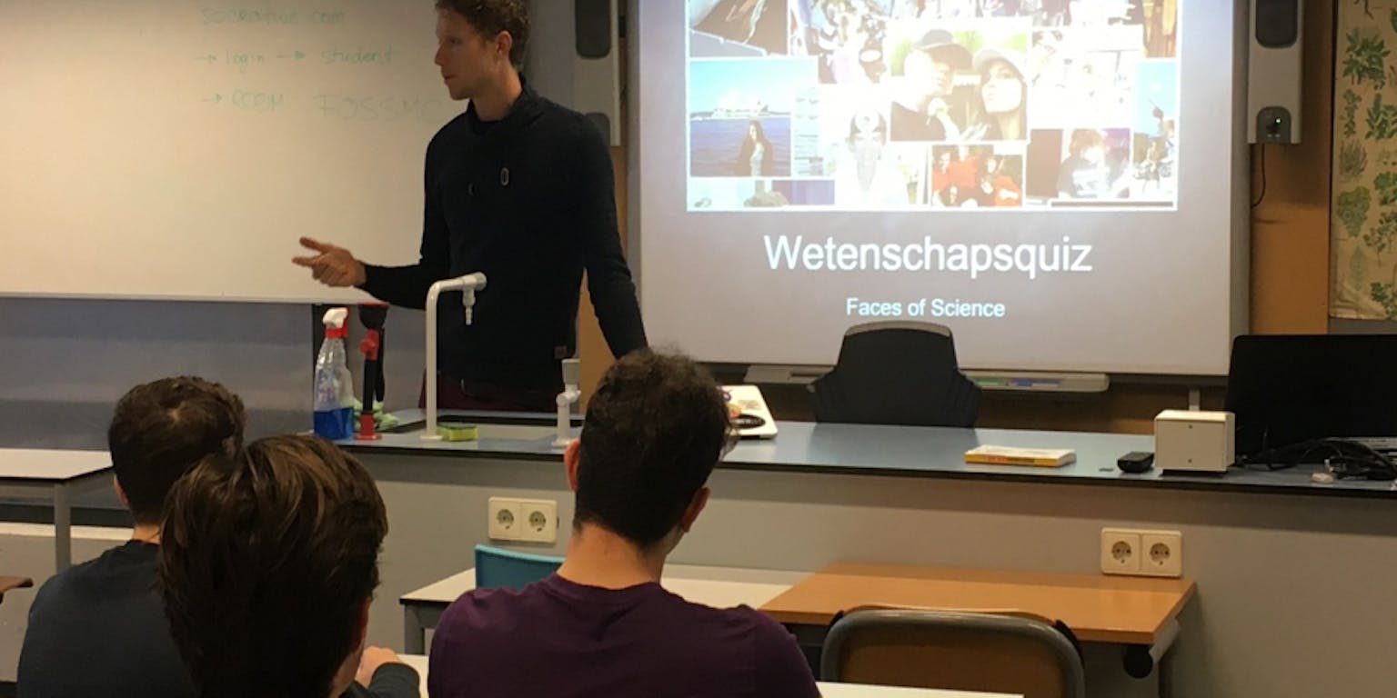 Jakob van den Eijnden voor NEMO KennislinkVanwege het eerste lustrum van Faces of Science nam ik in vijf bovenbouwklassen een wetenschapsquiz af. Samen met mijn oude natuurkundedocent, toen mevrouw Boumans maar nu gewoon Vera, begon ik mijn lessen met een korte introductie tot mijn eigen onderzoek en de baan van wetenschapper in het algemeen. Vervolgens ging de leerlingen in groepjes van drie á vier de uitdaging aan om tien wetenschapsvragen op te lossen. Het doel: tot de beste twee groepjes van de school behoren, om zo uitgenodigd te worden voor de landelijke finale in Amsterdam.