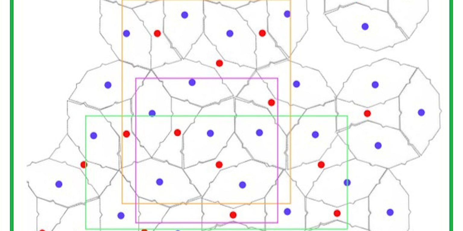 Als de verhouding niet exact te bepalen is, hoe groot is die dan ongeveer? Als je aanneemt dat het tegelpatroon in afbeelding 3 representatief is voor de oneindige betegeling, kun je er een steekproef op loslaten. In afbeelding 5 zijn drie willekeurige rechthoeken getrokken, en de middelpunten van de strikjes zijn aangegeven met rood, die van de bootjes met blauw. Je kunt nu simpelweg turven wat de verhouding strikjes/bootjes is in elk van de drie rechthoeken. De score die daar uit komt wijst duidelijk op één van de drie antwoorden a,b of c.