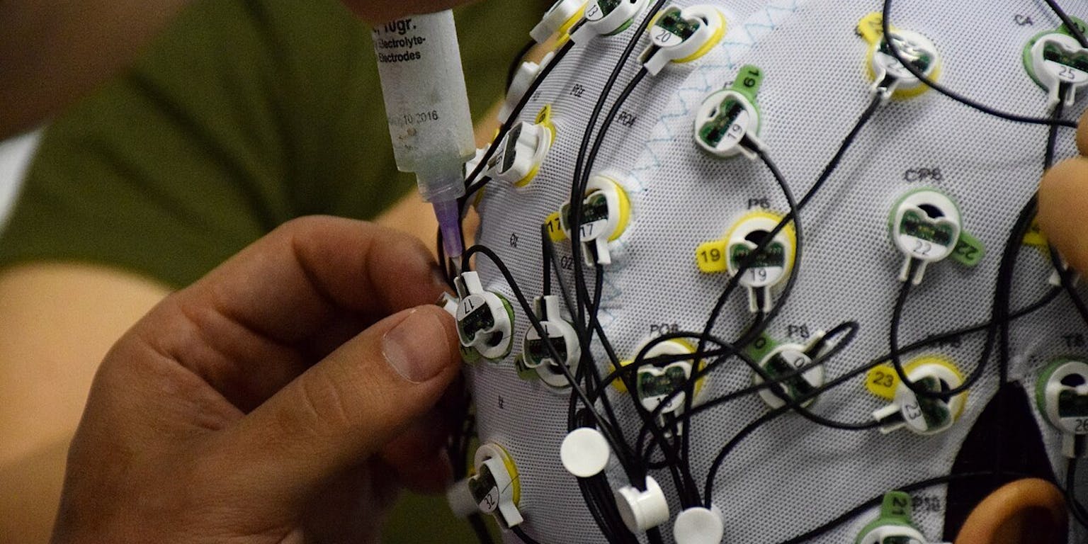 De welbekende EEG-muts. In de spuit zit een geleidende gel die de elektroden in de muts helpt de zwakke hersensignalen op te pikken.