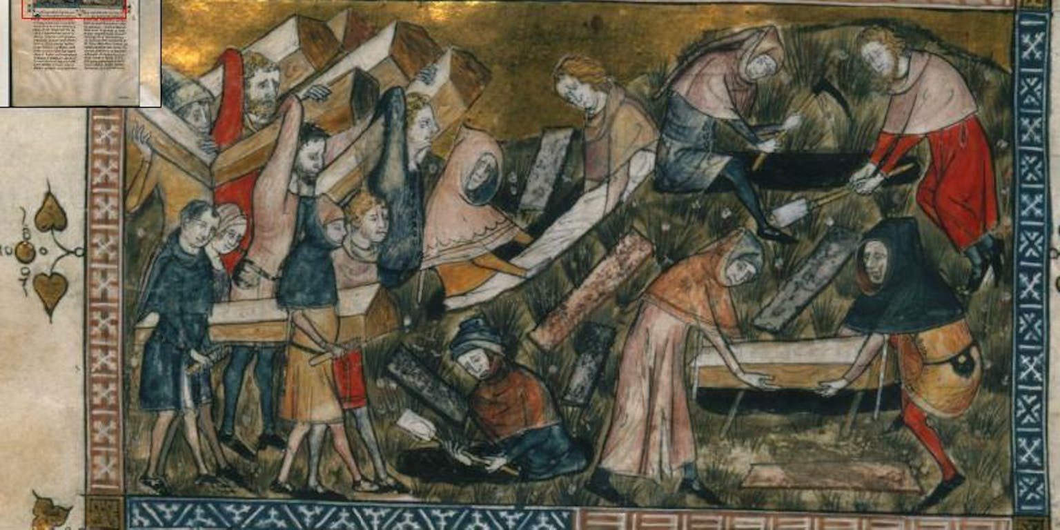 Inwoners van Doornik begraven hun pestslachtoffers, 1349.