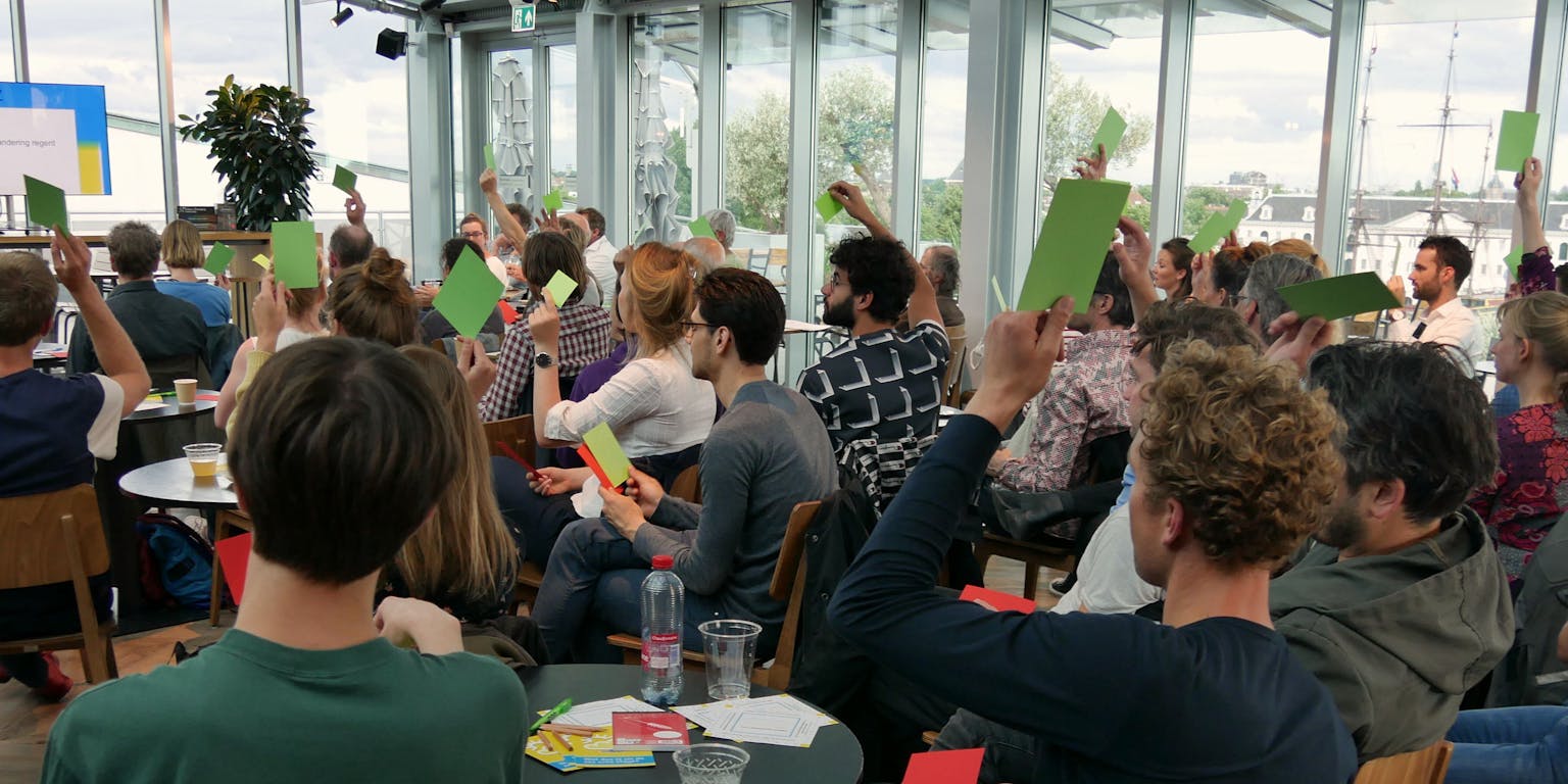 Kim Cerrone voor NEMO KennislinkModerator Desiree Hoving nam de goed gevulde zaal op het dak van het NEMO gebouw eerst een soort examen af. Nadat bij handopsteken was vastgesteld dat zich onder het publiek geen ‘klimaatontkenners’ bevonden (zij die ontkennen dat de mens de aarde opwarmt), wilde ze weten: “Wie heeft zich voorgenomen zelf iets aan het klimaat te doen?” Dat bleek zelfs onder dit publiek toch een beetje tegen te vallen. Lang niet iedereen was druk bezig met de tegels uit zijn achtertuin te halen of zijn eigen CO2-uitstoot terug te dringen.