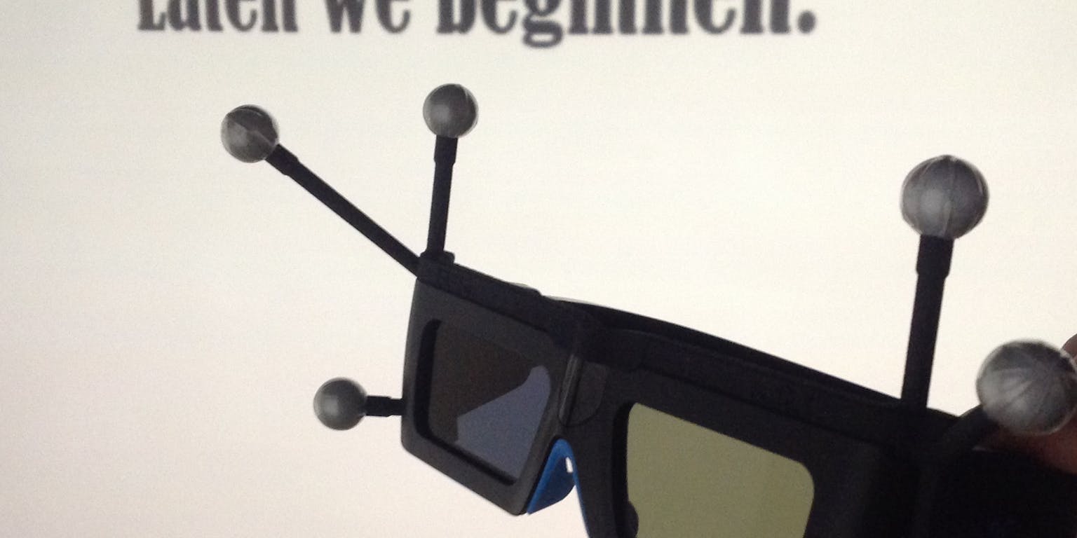 “Proefpersonen krijgen een speciale bril op zodat ze de beelden die op de drie schermen zijn geprojecteerd als één beeld waarnemen. Net zoals in de bioscoop bij een 3D-film”, legt Peeters uit. De bril ziet er futuristisch uit; er zitten aan weerszijden 3 zilveren bolletjes. Naar het waarom hoef ik niet lang te raden. Peeters: “Die bolletjes meten hoe je je hoofd beweegt. Naar voren, achter of opzij. De virtuele wereld beweegt dan met je mee.”