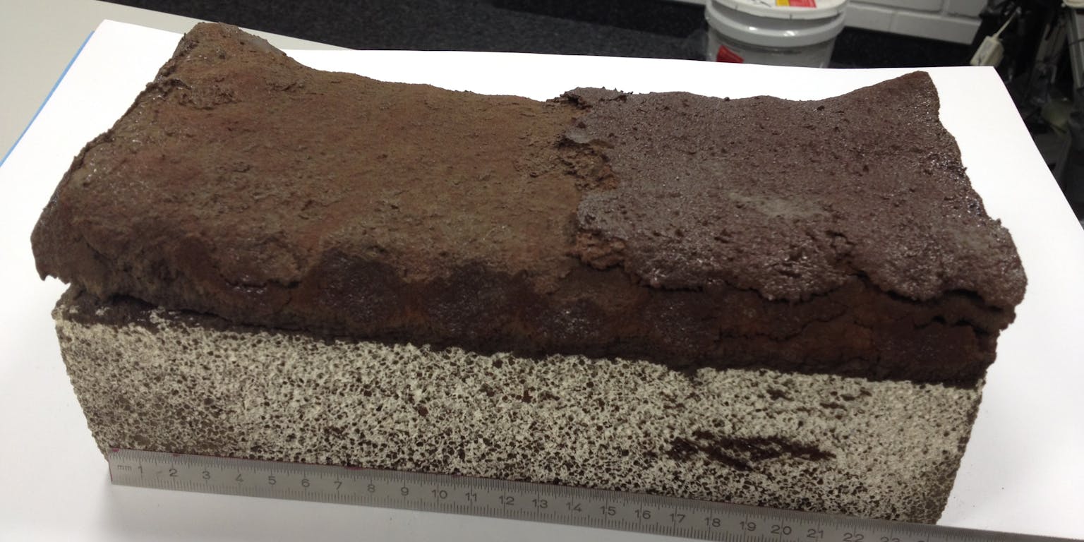Een 24 centimeter lange baksteen van replica-regoliet, uit de 3D-printer. In donkerbruin de geprinte steen (het grijze blok eronder dient als ondersteuning).