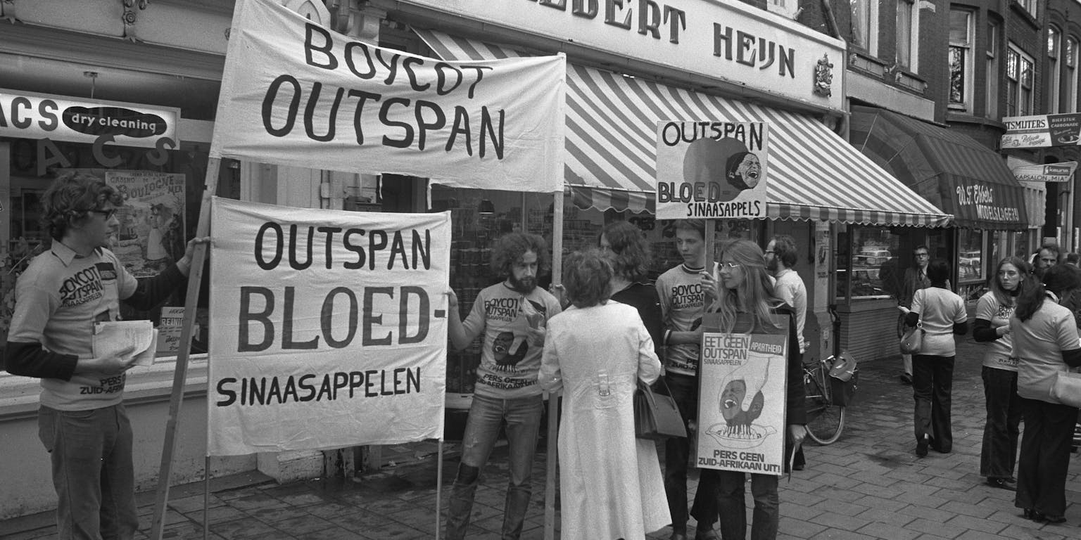 Om de regering van Zuid-Afrika tot veranderingen te dwingen, wilden de Nederlandse antiapartheidsbewegingen het land economisch treffen. Een vroege actie die wereldberoemd is geworden, is de Outspan-boycot uit 1973 en 1974. De antiapartheidsbewegingen riepen de Nederlandse burgers en supermarkten op om sinaasappelen van dit Zuid-Afrikaanse merk te boycotten, vanwege de erbarmelijke werkomstandigheden voor de donkere arbeiders op de Outspan-plantages. Dit was de eerste nationale boycotactie waaraan massaal gehoor werd gegeven en die vervolgens navolging kreeg in andere Europese landen.