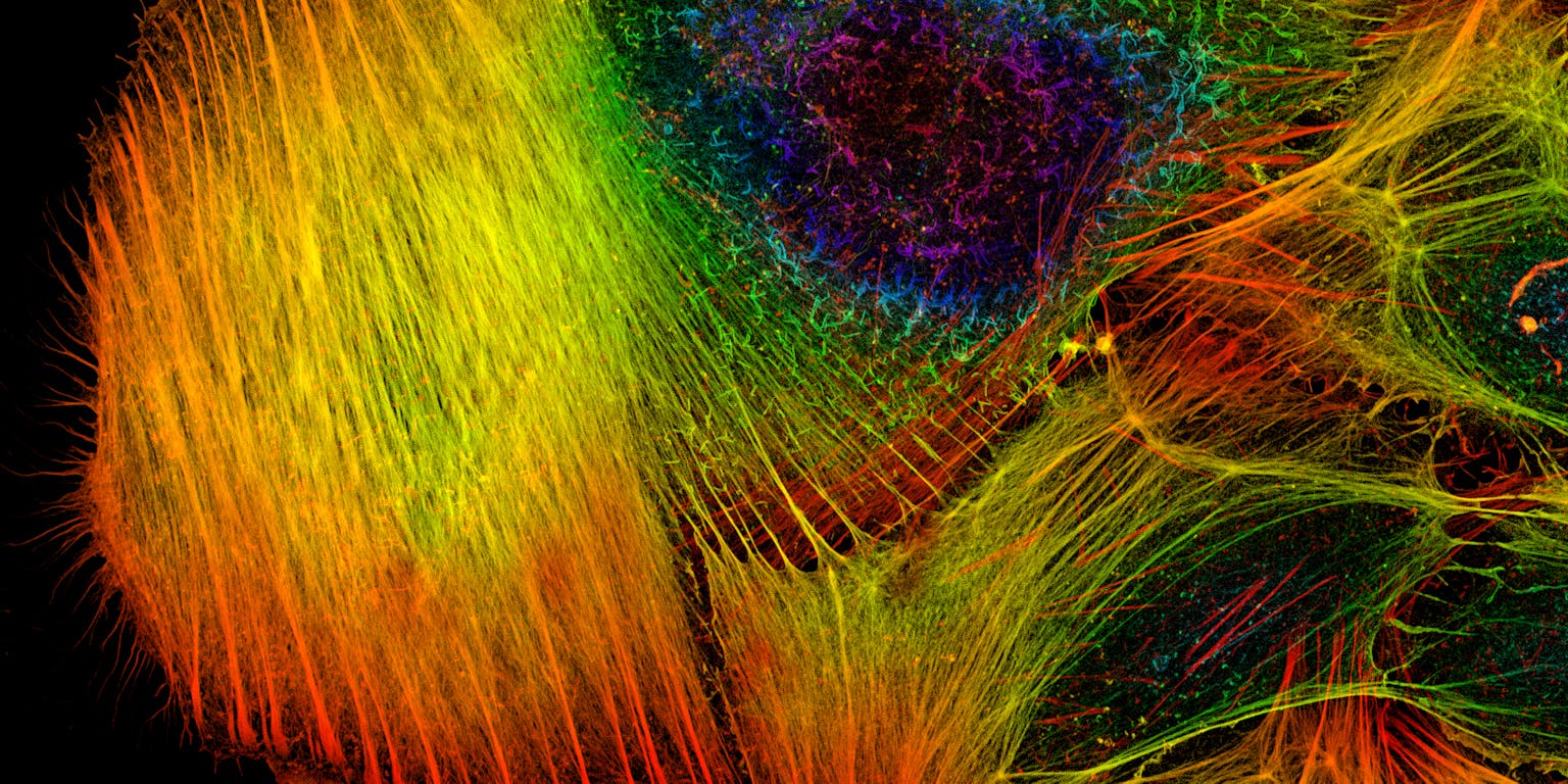 Met fluorescentie kunnen bepaalde delen van een cel zichtbaar worden gemaakt. Dit is niet de fluorescentie van een enkel molecuul, maar van miljarden exemplaren tegelijk. Dit is een kankercel waarbij vooral het skelet (het zogenoemde actinenetwerk) te zien is via een fluorescent molecuul dat eraan vast is gemaakt.