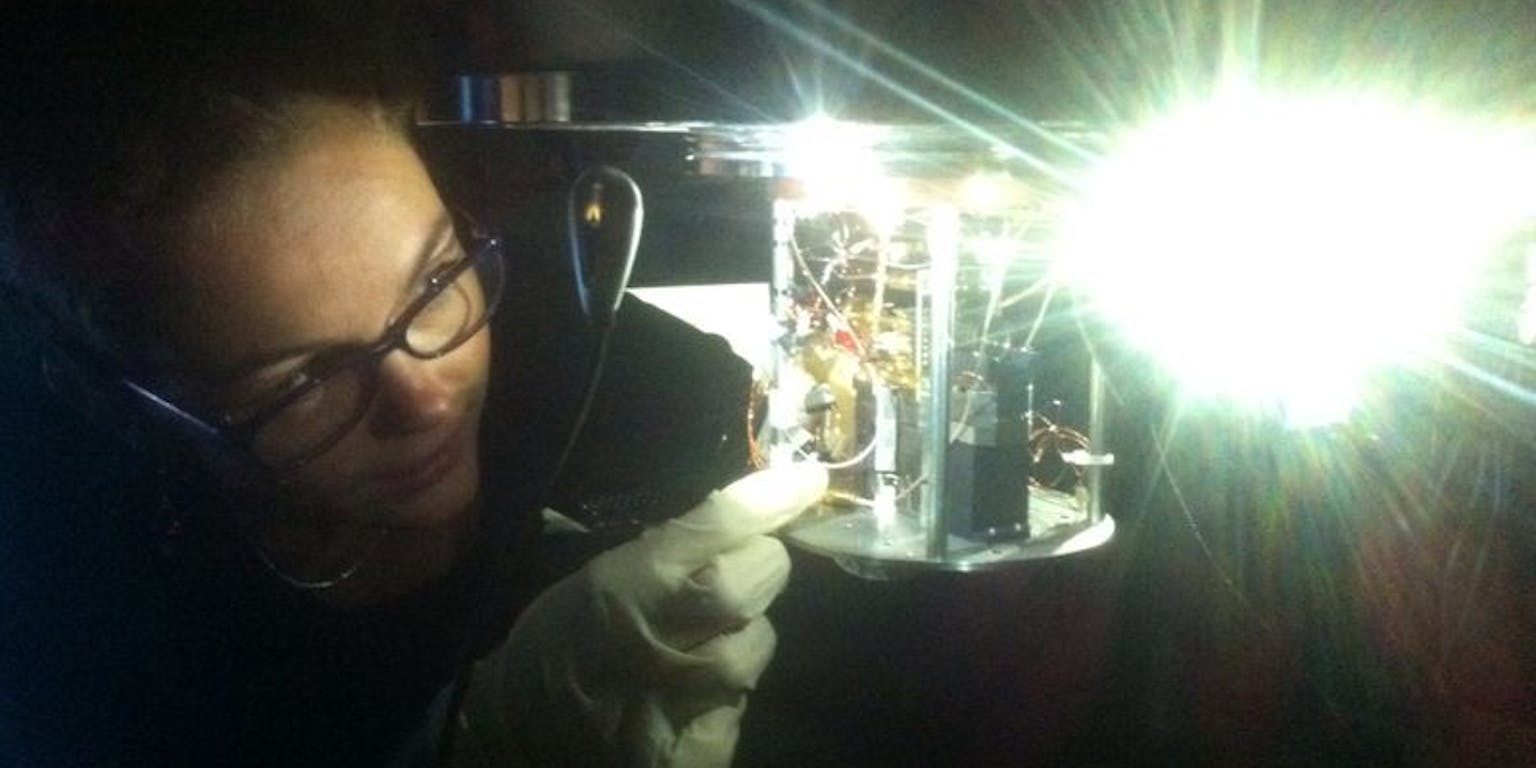 Hier zorg ik dat de diamant en de magneet goed zitten in het binnenste deel van de cryostaat. Ze staan op kleine beweegbare platformen, die wij van buiten kunnen besturen. Zo kunnen we verschillende stukken van de diamant bekijken, en het magneetveld variëren. Dit moet allemaal goed zitten, want we hopen de binnenkant van de cryostaat lang niet te zien, het mag lekker koud blijven.