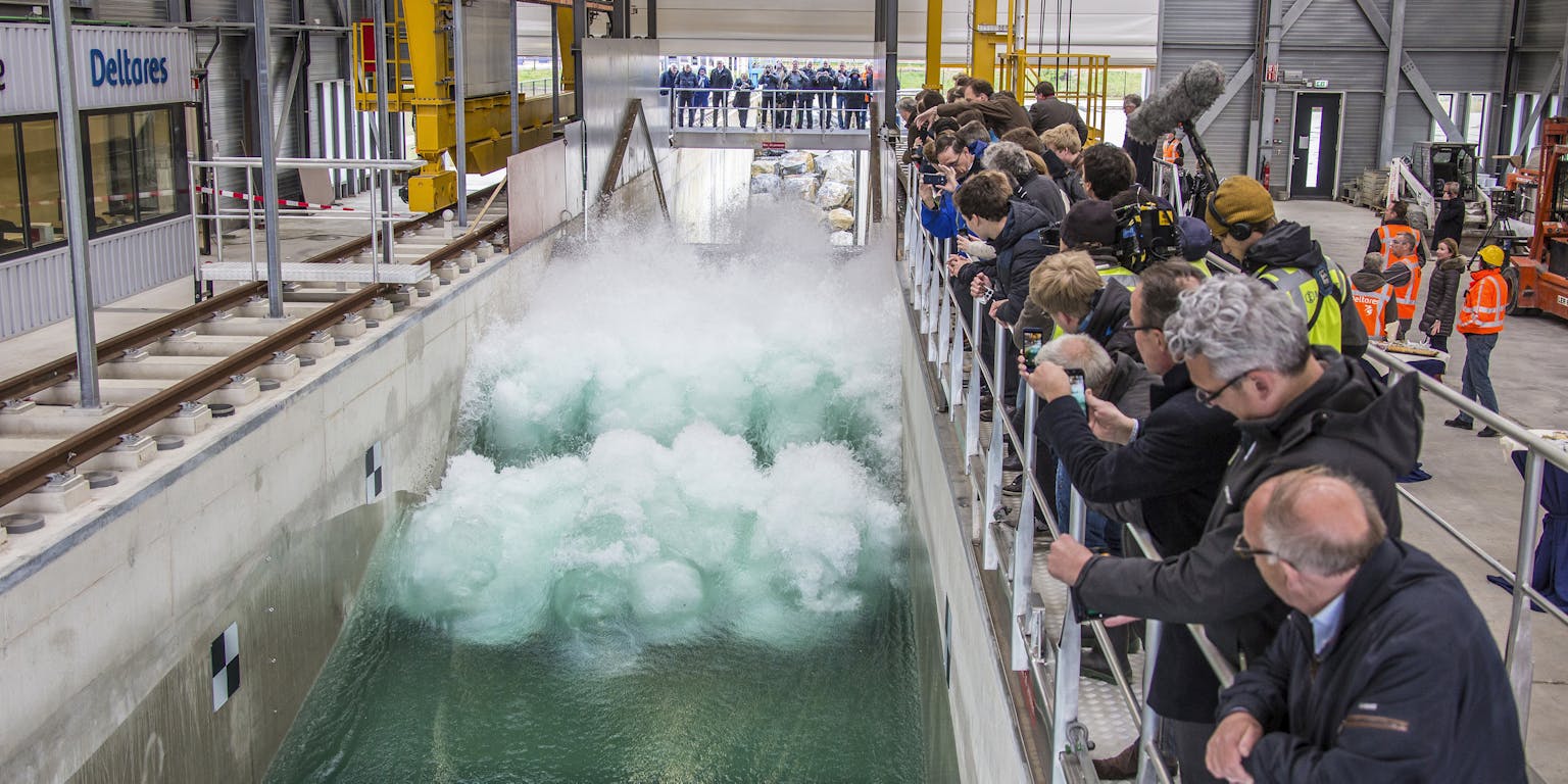 Thierry Schut (Deltares)Ondertussen ramt het water weer hard tegen de dijk in de Deltagoot. De klappen maken veel kabaal. De golven worden zo hoog, dat de mensen die aan de zijkant naar de proef kijken kletsnat worden. “We testen hier met een schaal van één op twee. Dit soort onderzoeken moet je op zo’n grote schaal doen, om er zeker van te zijn dat het echt goed werkt.”