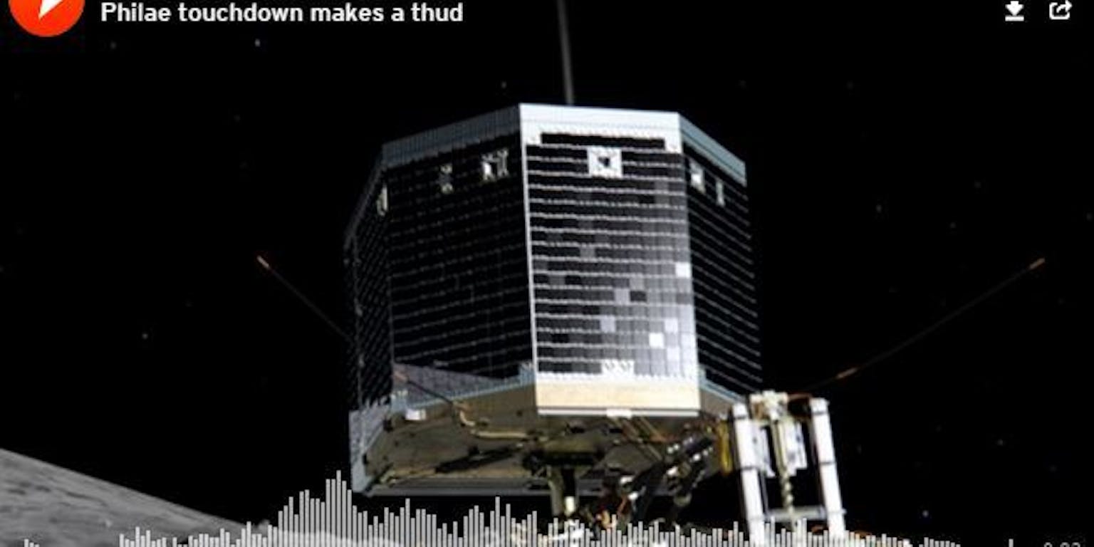 Toen de lander Philae nog zoek was op de komeet, waren wel de meeste van haar instrumenten al druk bezig om gegevens (via Rosetta) terug naar de aarde te seinen. Het sterkste staaltje was wel het anderhalve seconde durende geluid van de eerste touch down, waarna Philae weer honderden meters hoog de ruimte in veerde. Het geluid klinkt als een auto die een parkeerdeuk oploopt. Hoe kan de botsing tussen Philae en de komeet geluid gemaakt hebben? Er is daar toch geen atmosfeer?