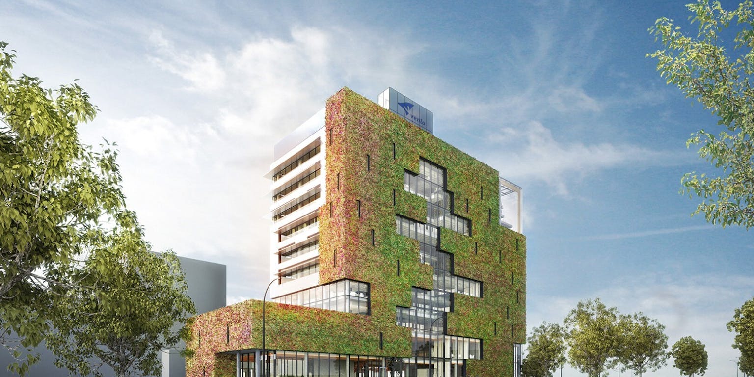 Artistieke weergave van het _Cradle to Cradle_-geïnspireerde Stadskantoor Venlo. Bovenop het dak van de hoogbouw zitten zonnecellen. Op het dak aan de rechterkant komt een daktuin voor dieren met kuiltjes en kleine heuveltjes om de biodiversiteit van de omgeving te bevorderen.