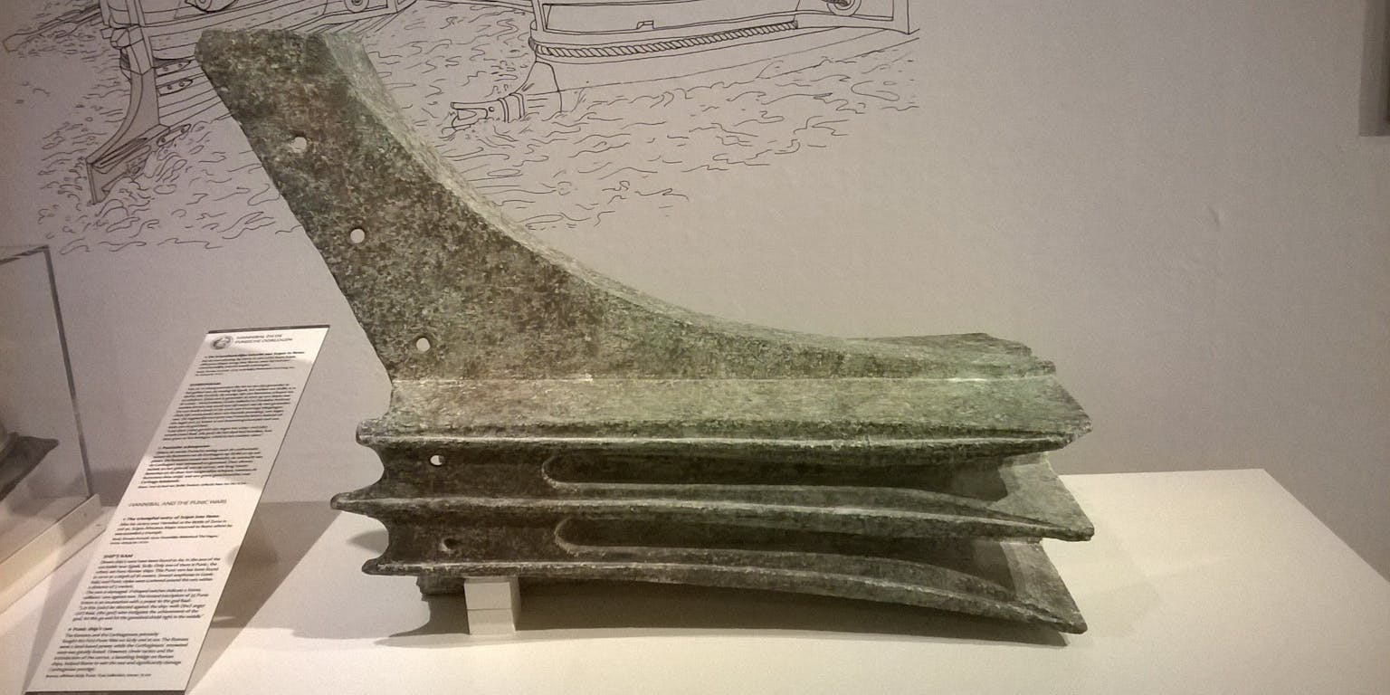 De scheepsram behoorde tot een schip dat is gezonken tijdens de Eerste Punische oorlog. De Carthagers waren als zeevaarders gepokt en gemazeld. Tijdens een zeeslag tegen de Romeinen ging iedereen er van uit dat de superieure Carthagers de kleinere en onervaren Romeinse vloot in de pan zou hakken. Niets bleek minder waar. De Romeinen, superieur in gevechten op het land, hadden een enterbrug (corvus) bedacht. Zo konden ze man-op-man gevechten houden, in plaats van moeilijke tactieken uit te moeten voeren met hun schepen. Geheel onverwachts wonnen ze deze zeeslag bij Sicilië.
