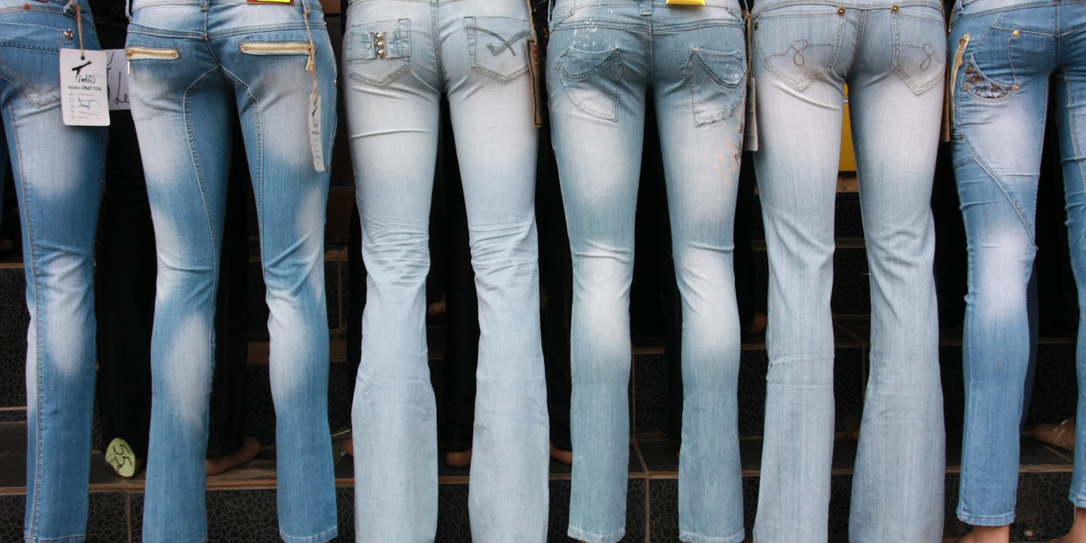 In de Chinese provincie Guangdon vindt de helft van de wereldwijde productie van jeans plaats. Het versleten uiterlijk kan op verschillende manieren worden bereikt: door stone washing, bleken met zuur of met het – officieel verboden – zandstralen. Gewoon zand (silicium) is in zeer kleine afmetingen schadelijk voor de longen.