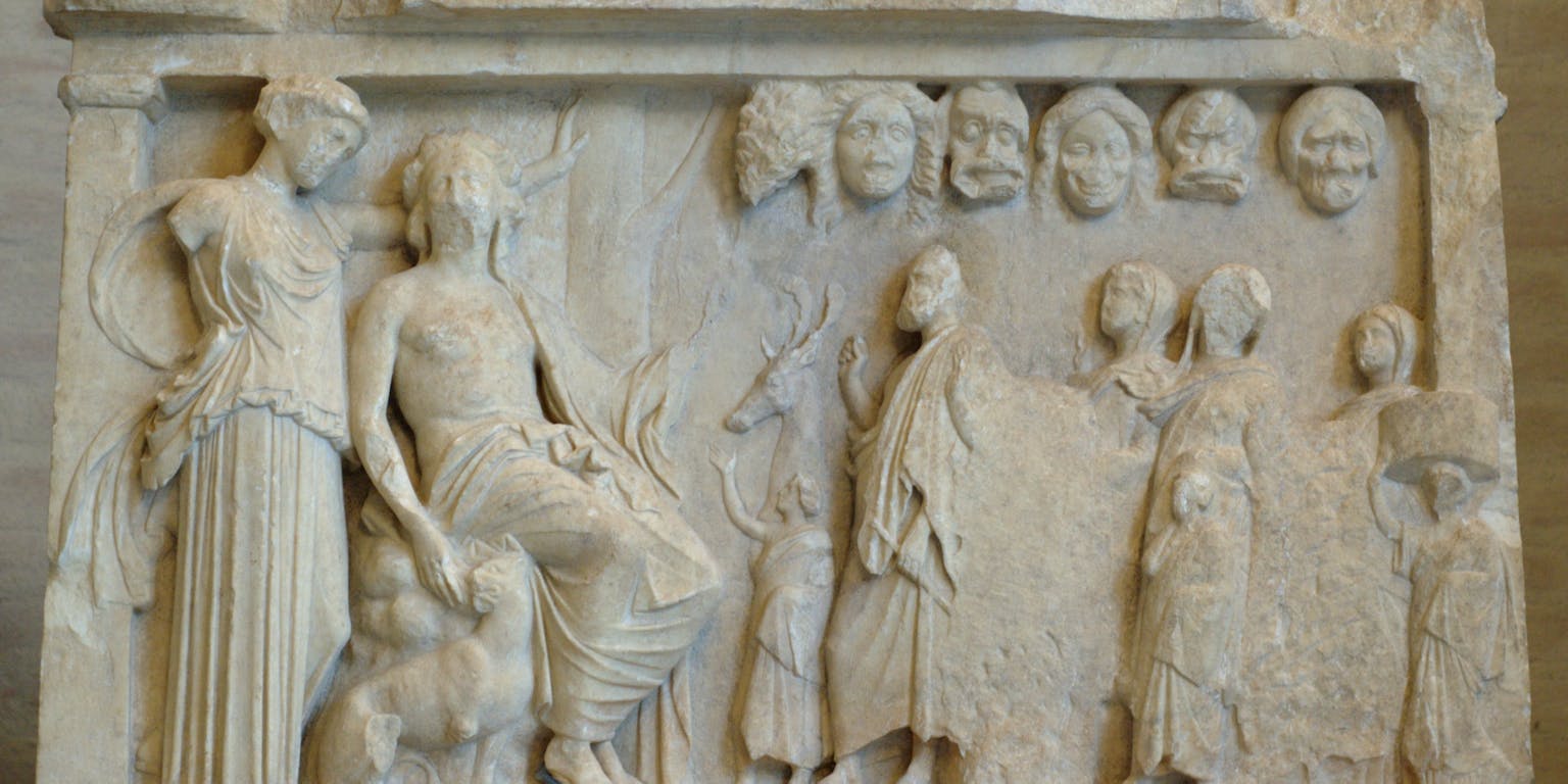 Grieks relief met theatermaskers uit de vierde eeuw v. Chr.