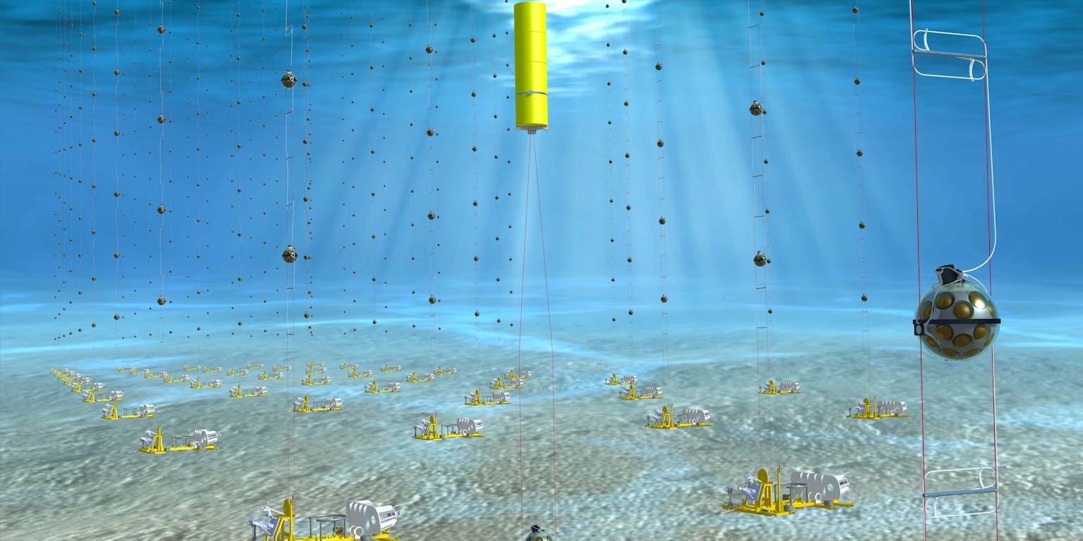 Neem een flinke teug adem en zak in gedachten langzaam naar de zanderige bodem van de Middellandse Zee, zo’n veertig kilometer voor de Franse kust. Terwijl het water van helder blauw naar zwart kleurt kom je maar weinig tegen. Misschien een verdwaalde tonijn of potvis. Maar op 200 meter bóven de zeebodem (op een diepte van zo’n 2250 meter) doemt er opeens een trosje knalgele boeien op. Deze drijvers houden een lijn van neutrino-detector KM3NeT (Cubic Kilometre Neutrino Telescope) omhoog.