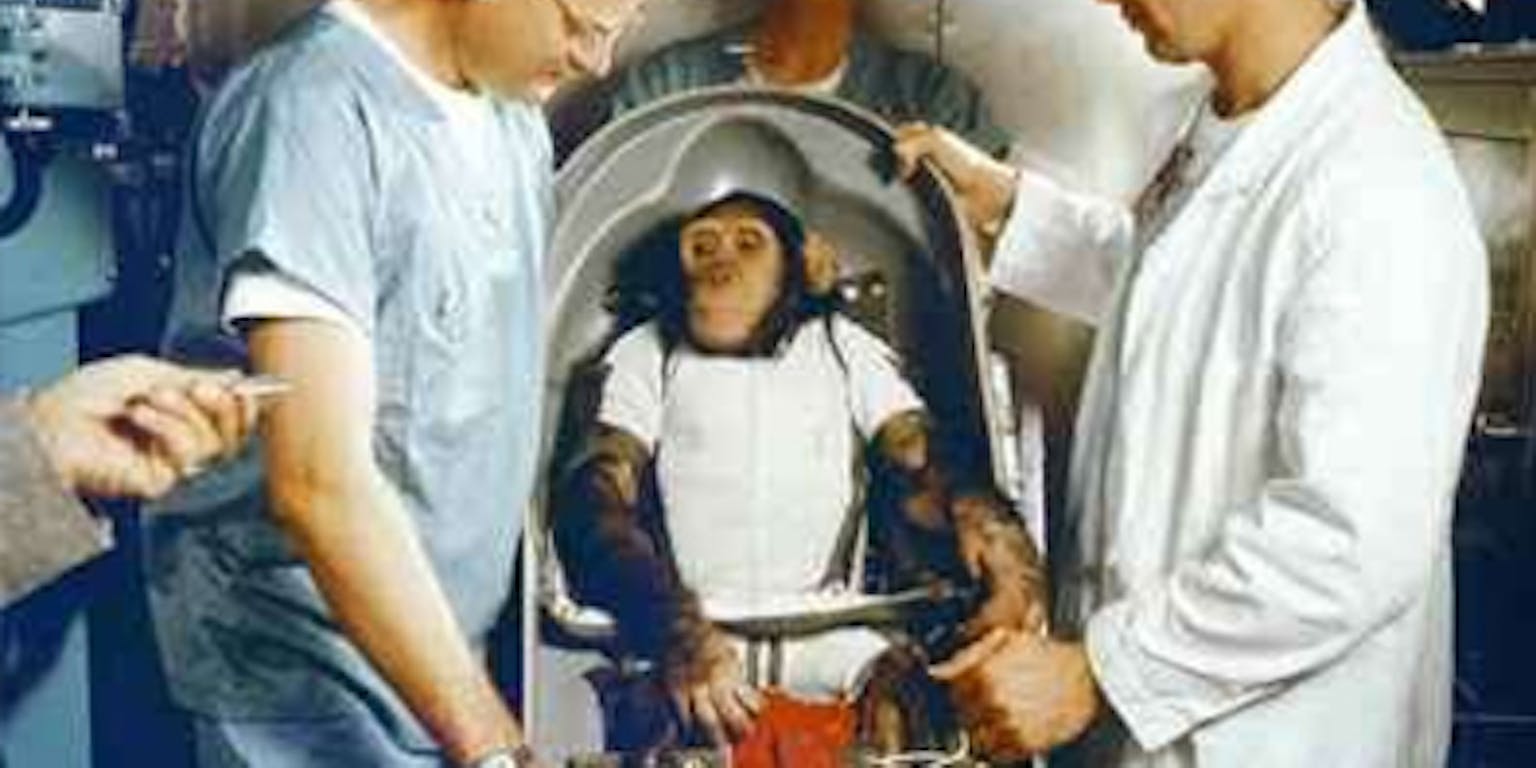 Dat betreft Ham, de eerste Amerikaan in de gewichtloze ruimte. Ham was een ‘chimponaut’: een van de zestien chimpansees die werden getraind voor het Mercury-project, ter voorbereiding van een bemande ruimtevlucht. Elke chimponaut droeg maandenlang een ruimtepak van nylon en lag vastgebonden in een plastic ‘wieg’ alvorens te worden blootgesteld aan de nagebootste condities van een ruimtevlucht.
