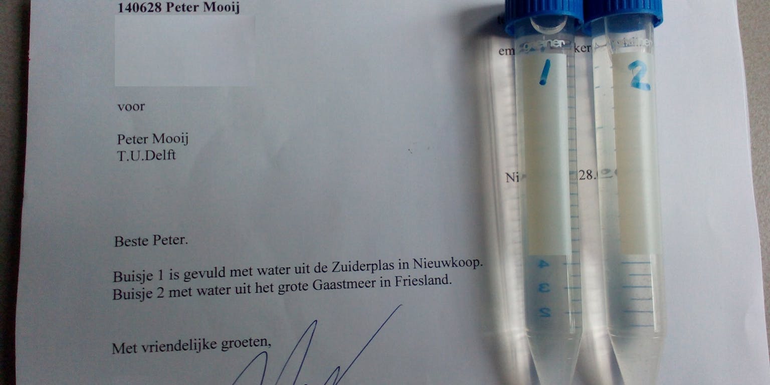 De oproep om buisjes met water op te sturen blijkt niet aan dovemansoren gericht. De eerste buisjes zijn binnen, waardoor nu ook algen uit de Zuiderplas in Nieuwkoop en het Groot Gaastmeer in Friesland in de race zijn om de dikste alg te worden. Meer buisjes zijn altijd welkom, mail naar p.r.mooij@tudelft.nl en de lege buisjes komen je kant op.