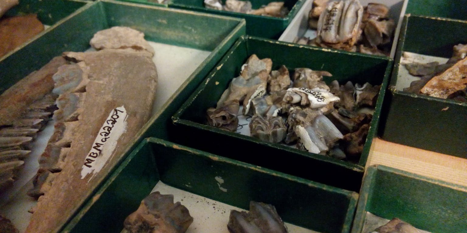 Fossiele rundertanden en kaakfragmenten. In 1907 verzameld in Trinil, Indonesië, tegenwoordig in het Museum für Naturkunde in Berlijn.