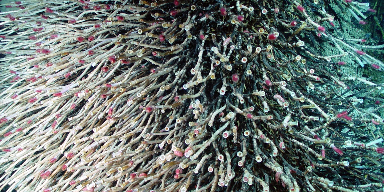 Diepzee schoorsteen bedekt met kokerwormen. Bij hydrothermale bronnen wemelt het nu van het leven.