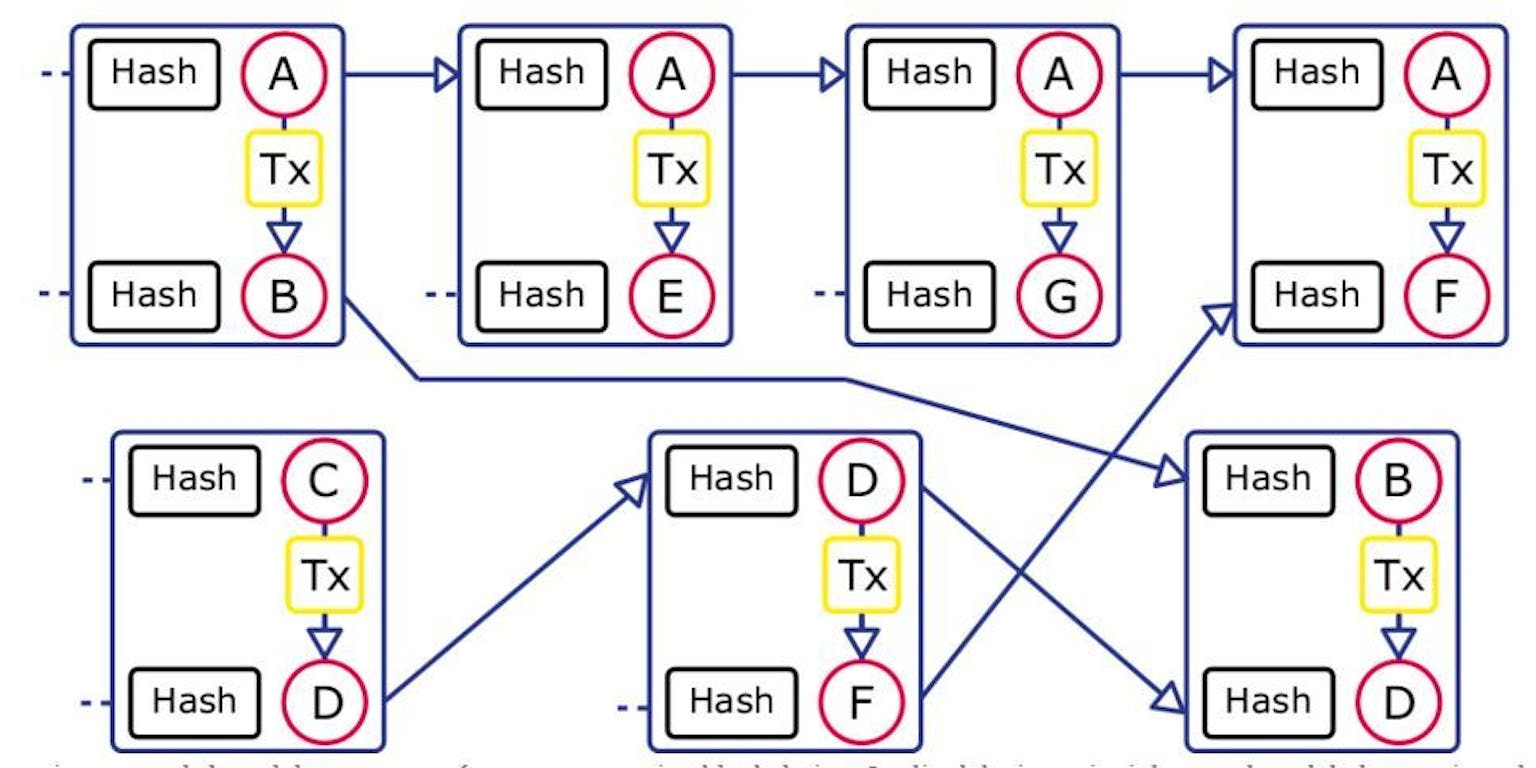 Schema van een blockchain met vertakkingen, die wordt gewaarborgd door telkens de hash van de data te berekenen. ‘Tx’ staat voor ‘transactie’. Als de blockchain dient om een cybermunt als bitcoin te beveiligen, is een transactie een betaling. Maar een transactie kan ook het downloaden van een contract, of de toegangscode voor een online muziekstuk of een film zijn. De TU Delft heeft sinds 2007 een Blockchain-Lab waar een cybermunt en andere blockchain-toepassingen verder worden ontwikkeld.