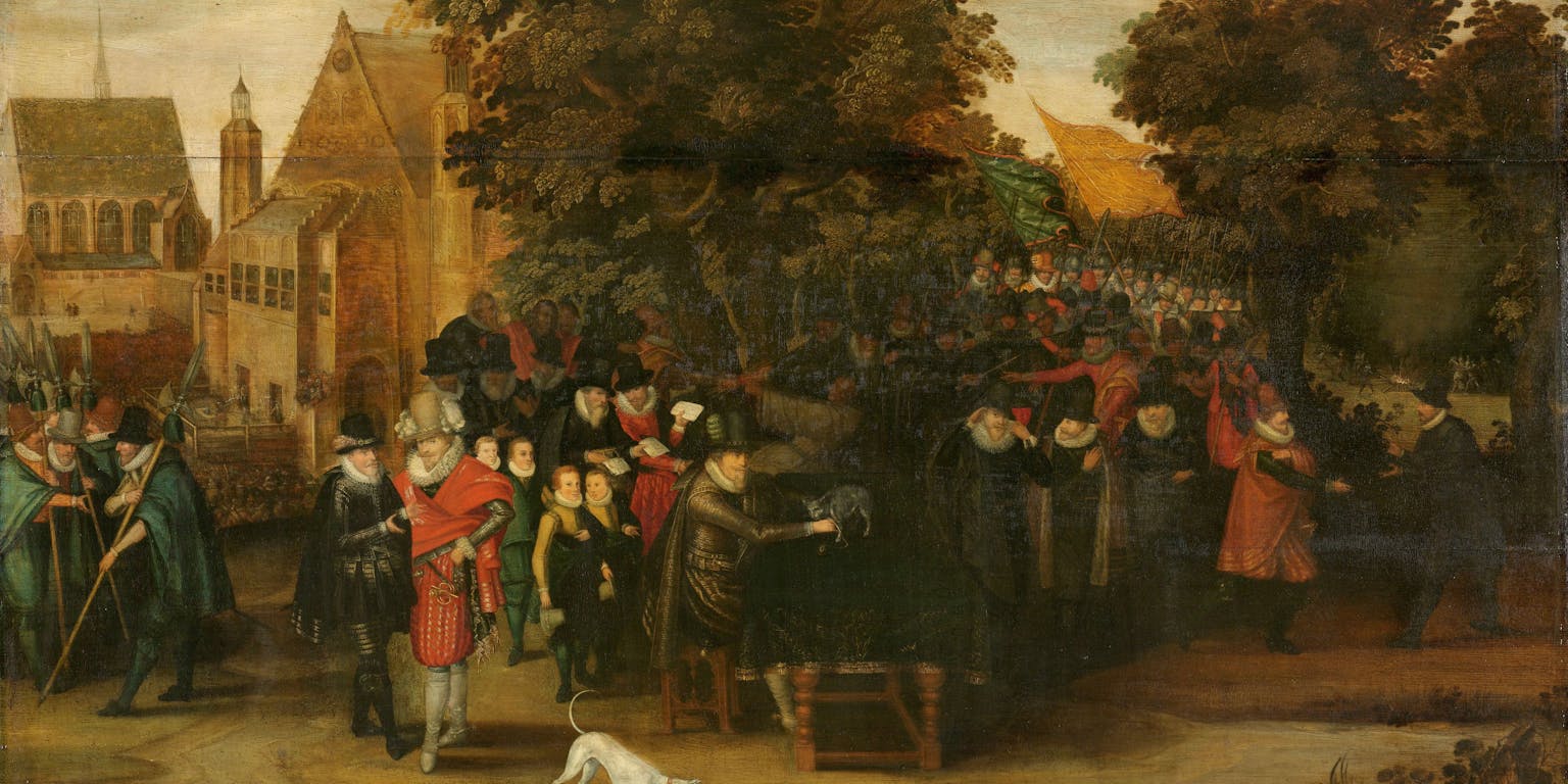 Het afdanken van de waardersgelders door prins Maurits op de Neude te Utrecht, 31 juli 1618. (Pauwels van Hillegaert, 1627)