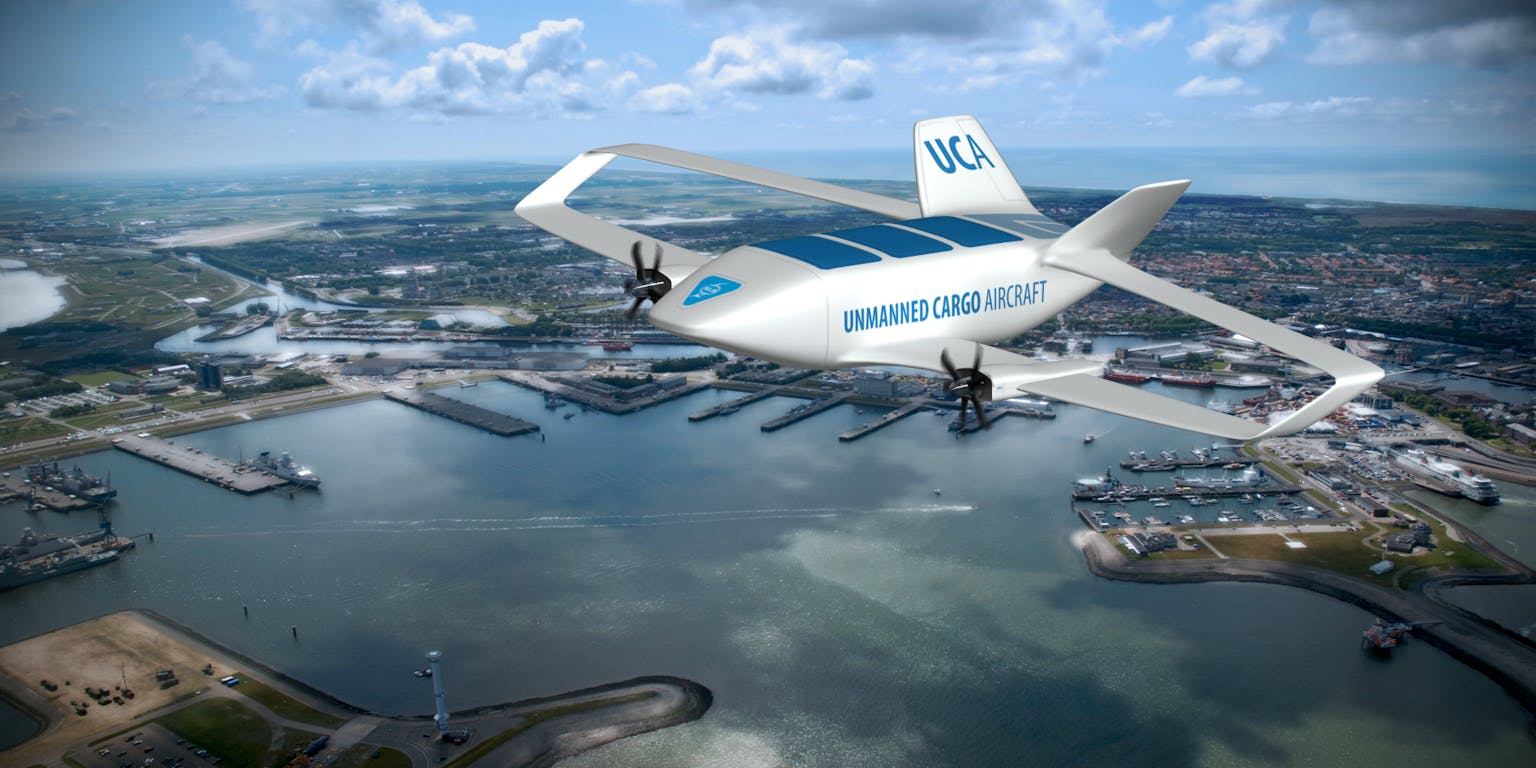 Een ontwerp van hoe een onbemand vrachtvliegtuig er uit gaat zien.