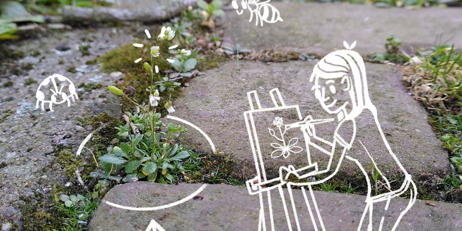 Een stukje verderop hangt een andere tekening van een minuscuul plantje, de vroegeling. Ik heb hem zelf ook getekend en kan hem daarom buiten altijd vinden. Je hebt een sterk vergrootglas nodig om alle bladhaartjes, meeldraden en zaadjes te kunnen zien. Je kan hem nu bloeiend op straat vinden. Uit een rond rozetje met blaadjes van een paar centimeter groeit één stengeltje met witte bloemetjes. Ze groeien vaak in groepjes bij elkaar, dat maakt het zoeken ietsje makkelijker. Hij bloeit nog tot mei, ga dus op tijd op zoek en voer hem in op de stoepplantjesonderzoek website!