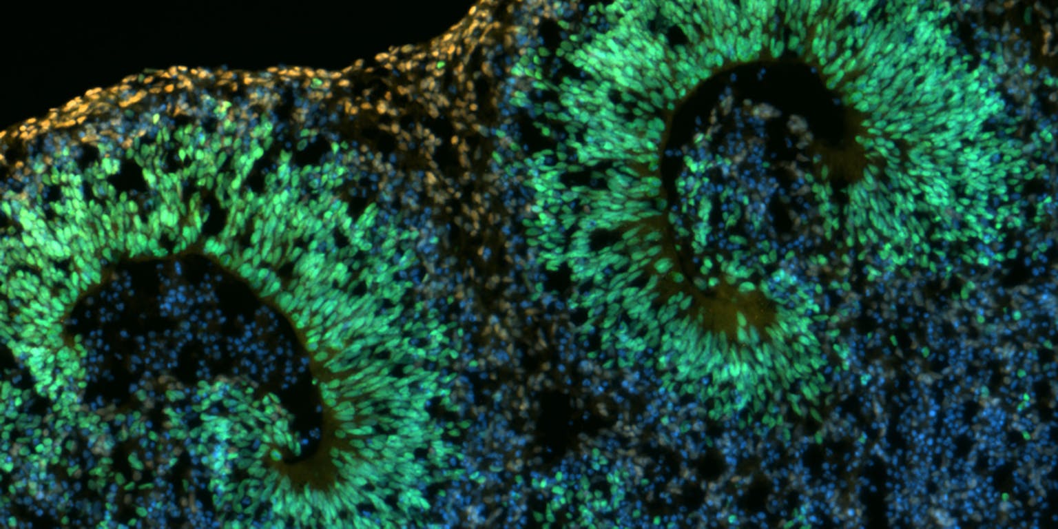 “We verplaatsen de plaat dan naar een orbital shaker, een soort roterend platform dat de cultuur in beweging houdt. Zo komen er voldoende zuurstof en voedingsstoffen bij de cellen om verder te groeien.” Dan is het een kwestie van de cellen levend houden en wachten. Na drie tot vier weken beginnen de organoïden een soort ventrikels te vormen met neuronale stamcellen in het midden. “Uit die stamcellen ontwikkelen neuronen, die naar de buitenkant van de ventrikels gaan. Dat proces is vergelijkbaar met wat je in een echt ontwikkelend brein ziet.”
