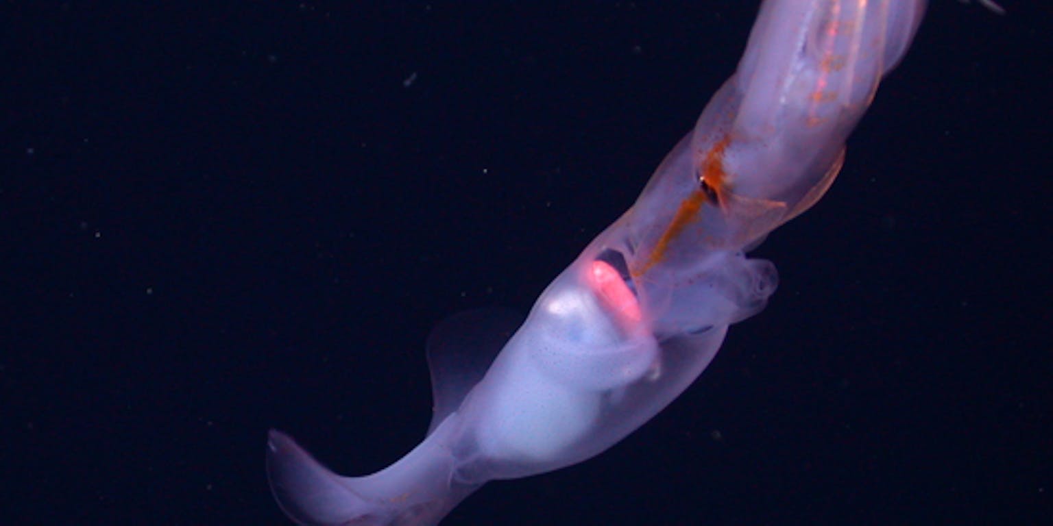 De meeste inktvissen vangen hun prooi met razendsnelle tentakels. De diepzee-inktvis Grimalditeuthis bonplandi niet. Grote kans dat zijn dunne, fragiele tentakels afbreken als je hem zou vangen. En in plaats van zuignappen of haakjes zitten er flapperende membranen aan de tentakels. Wat moet deze inktvis met zulke vreemde tentakels? Onderzoekers zijn er nu achter dat hij ze als een vislijn gebruikt; inclusief nep-aas.