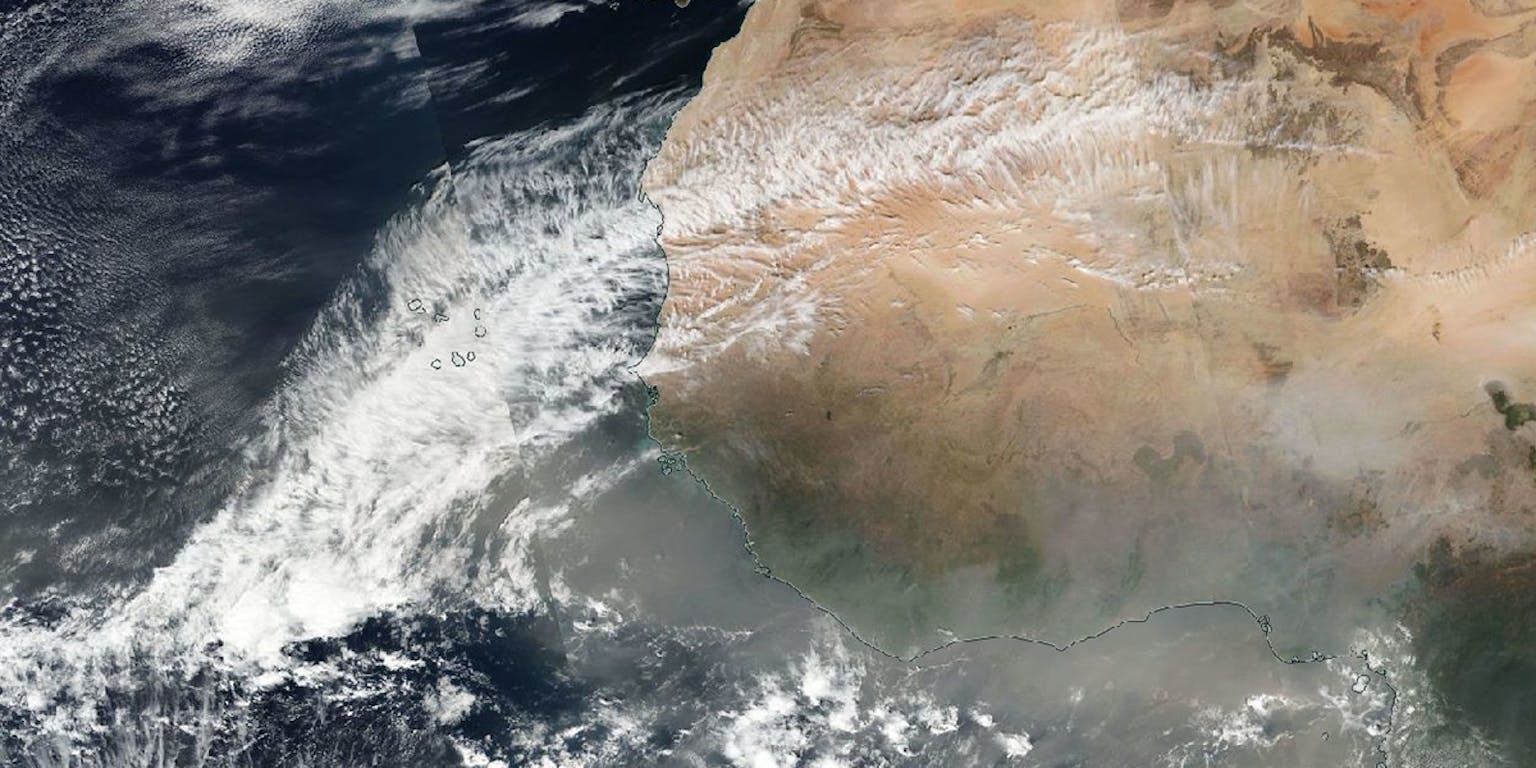 We varen inmiddels in de tropen, maar van een strak blauwe lucht kunnen we niet genieten. Die zit verstopt achter een dikke laag woestijnstof dat neerdwarrelt op ons schip. Zo wordt het wit-blauwe onderzoeksschip Pelagia door de dagen heen steeds bruiner.