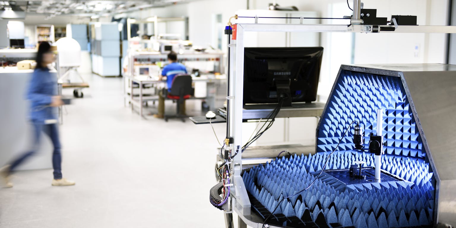 Onderzoekers hebben in het lab de ruimte en juiste apparatuur om dat uit te pluizen. “Dit lab is zo gebouwd dat het minimaal vijftig jaar mee moet gaan. Alles is daarop voorzien. De dikke deuren schermen bijvoorbeeld signalen tot tachtig gigahertz af. Die vraag had het bedrijf dat ze maakte, nog nooit gehad. Meestal is voor dit soort labs veertig gigahertz genoeg. Maar wij denken dat de toekomst in het hoog-frequente zit, zoals bij de wifi-verbindingen”, benadrukt Van Dommele. “Met dit lab kunnen we ons daarom volledig blijven richten op onderzoek naar dit soort draadloze verbindingen van de toekomst.”
