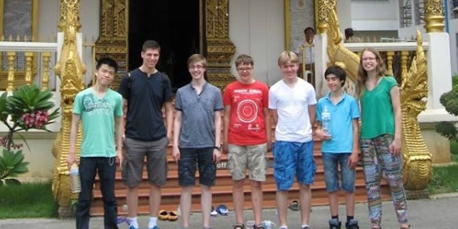Het olympiade team in Chiang Mai. Van links naar rechts de teamleden Yuhui Cheng, Mike Daas, Rob Zwetsloot, Tim Brouwer, Dirk van Bree. Daarnaast de pas dertienjarige Levi van de Pol, die bij de Benelux Olympiade nog de beste Nederlander was. Bij de laatste selectie viel hij net buiten het Nederlandse team, maar ging wel mee naar Thailand om alvast ervaring op te doen. Helemaal rechts teamlid Eva van Ammers.