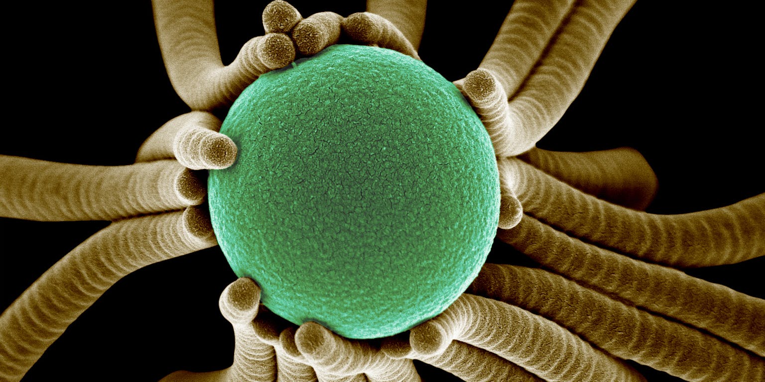 Via zelfassemblage plakken kunststof nanoharen aan elkaar en vormen gedraaide plukjes ‘haar’. Hier vervoeren ze polystyreen bolletjes van 2,5 mm groot. De opname is gemaakt met een Scanning Electron Microscoop (SEM).