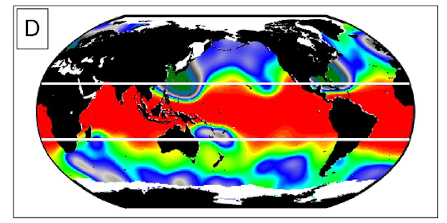 Het effect van de zeespiegelstijging op de frequentie van hoogwater is in de tropen het sterkst, omdat de variatie door eb en vloed en stormen daar gemiddeld minder is dan verder van de evenaar af. Dus hetzelfde aantal centimeters zeespiegelstijging weegt rond de evenaar relatief het zwaarst. Daardoor kan op sommige tropische kusten de vijftigjaars-waterhoogte in 2050 zelfs ongeveer elk jaar gaan optreden.