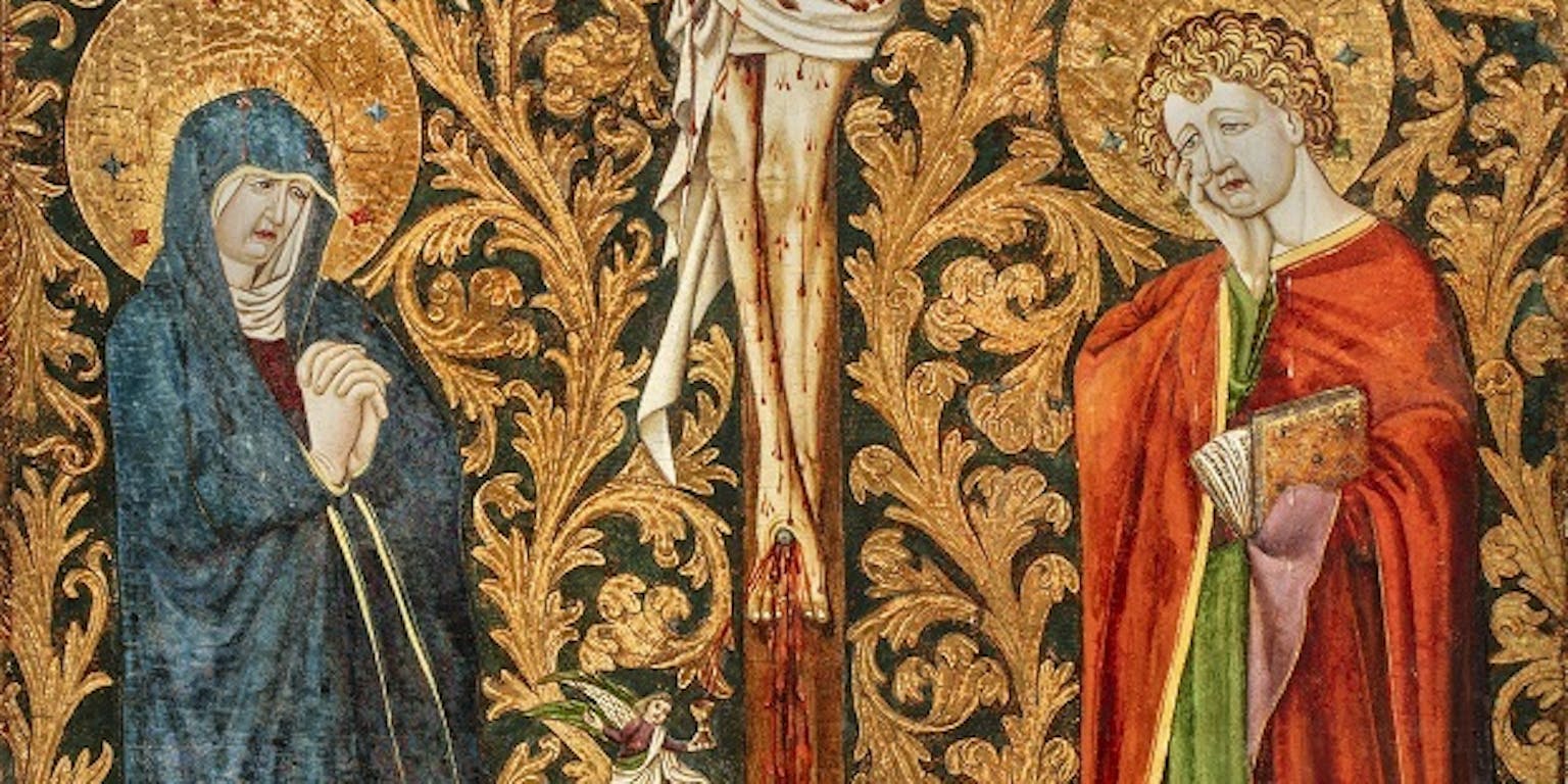 De kruisiging van de Meester van de Bewening van Christus in Lindau (die deel uitmaakt van de collectie van Museum Catharijneconvent) toont Christus aan het kruis omringd door vier engelen die zijn bloed opvangen. Maria en Johannes de evangelist rouwen om zijn dood. De figuren zijn afgebeeld tegen een blauwe achtergrond met gouden ranken.