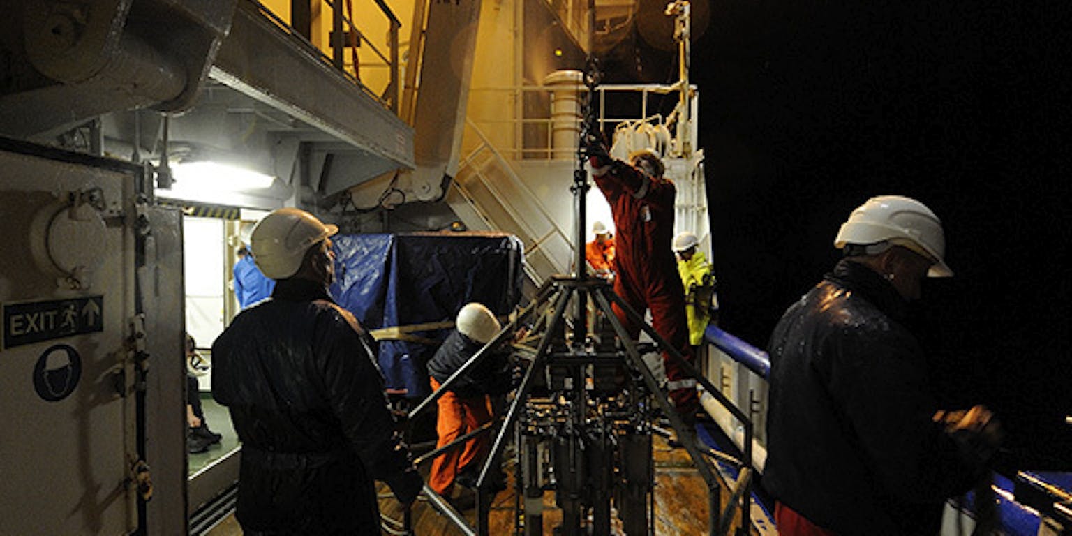 Na het avondeten zijn we nog niet klaar. ’s Nachts werken op een onderzoeksschip is geen zeldzaamheid, want tijd op zee is erg kostbaar. De schemerlampen staan inmiddels al op het dek voor de laatste show van vanavond: de multicorer. Wanneer dit ronde apparaat 4.300 meter is gedaald, landt het zachtjes op de zeebodem en vullen twaalf cilinders zich met sediment. Deze modderige kernen zitten vol met organisch materiaal dat ons iets vertelt over het klimaat tot 400 jaar terug. In deze bodemmonsters zijn we ook op zoek naar foraminiferen. De isotopensamenstelling van deze eencellige diertjes met een kalkskelet wordt later in het lab gemeten. Daarmee kunnen we achterhalen hoe warm het zeewater was op het moment dat de foraminiferen leefden.