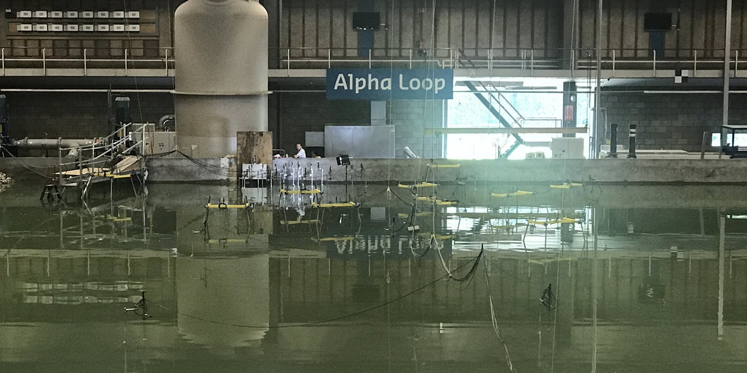Robert Visscher voor NEMO KennislinkHeller laat zijn onderzoeksopstelling zien. Het grote bassin, dat wel wat weg heeft van een zwembad, zit vol met meetapparatuur. Op 35 plekken in het water gaan de wetenschappers met apparatuur in kooitjes na hoe hoog en snel een golf is. Dan zijn er ook nog camera’s die alles vastleggen en sensoren die de precieze beweging van het blok detecteren.