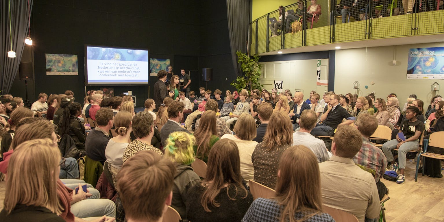 Samen met publiek en experts werd er gediscussieerd over stellingen als: ‘Een wereld waarin kinderen geen aangeboren achterstand meer hebben, is een betere wereld’ en ‘Ik zou het DNA van mijn kind aanpassen als het daardoor meer kans maakt zijn talenten beter te ontwikkelen’. Iedereen in de zaal kon zijn mening laten zien door een blije, boze, twijfelende of verbaasde emoticon in de lucht te steken.