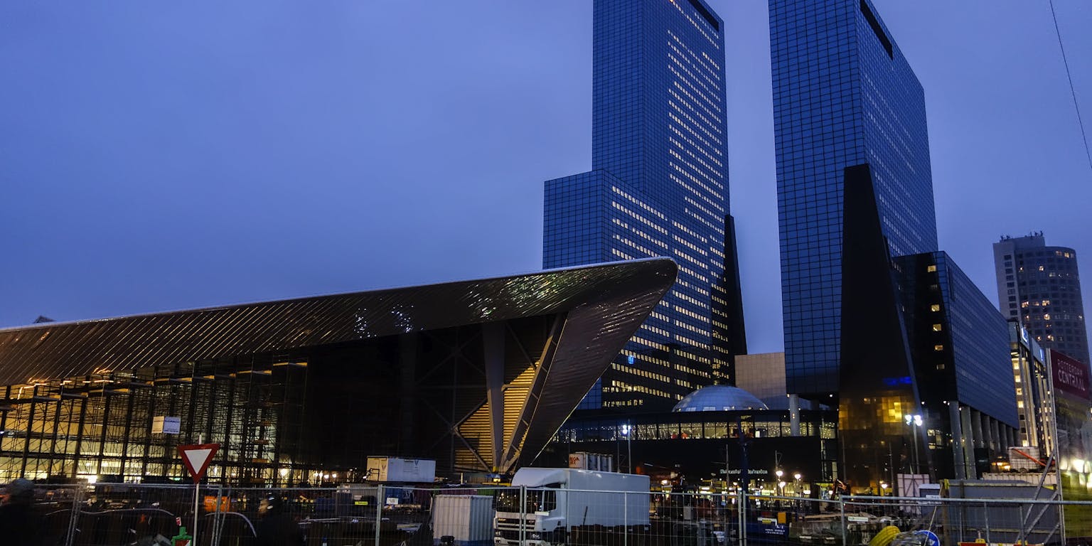 De regenradar komt bovenop het gebouw van Nationale Nederlanden te staan bij Rotterdam Centraal Station.