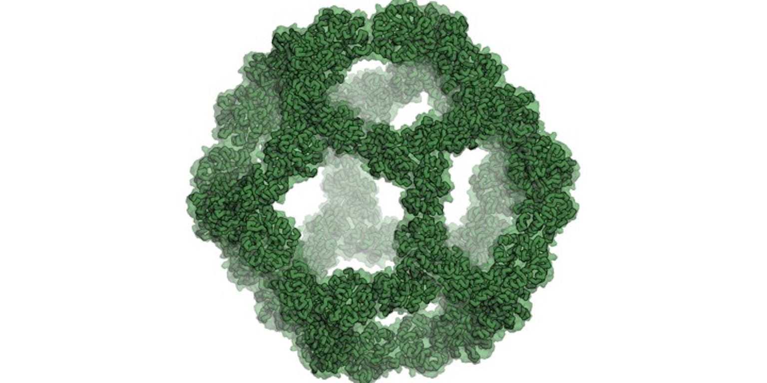 Een regelmatig twintigvlak kennen we vooral als geometrische figuur. Nu blijkt dat je zo’n ‘voetbal’ ook met eiwitten kunt maken. Het resultaat is een groot complex dat lijkt op de eiwitmantel van een virus en waarin je wellicht een geneesmiddel kunt verpakken.