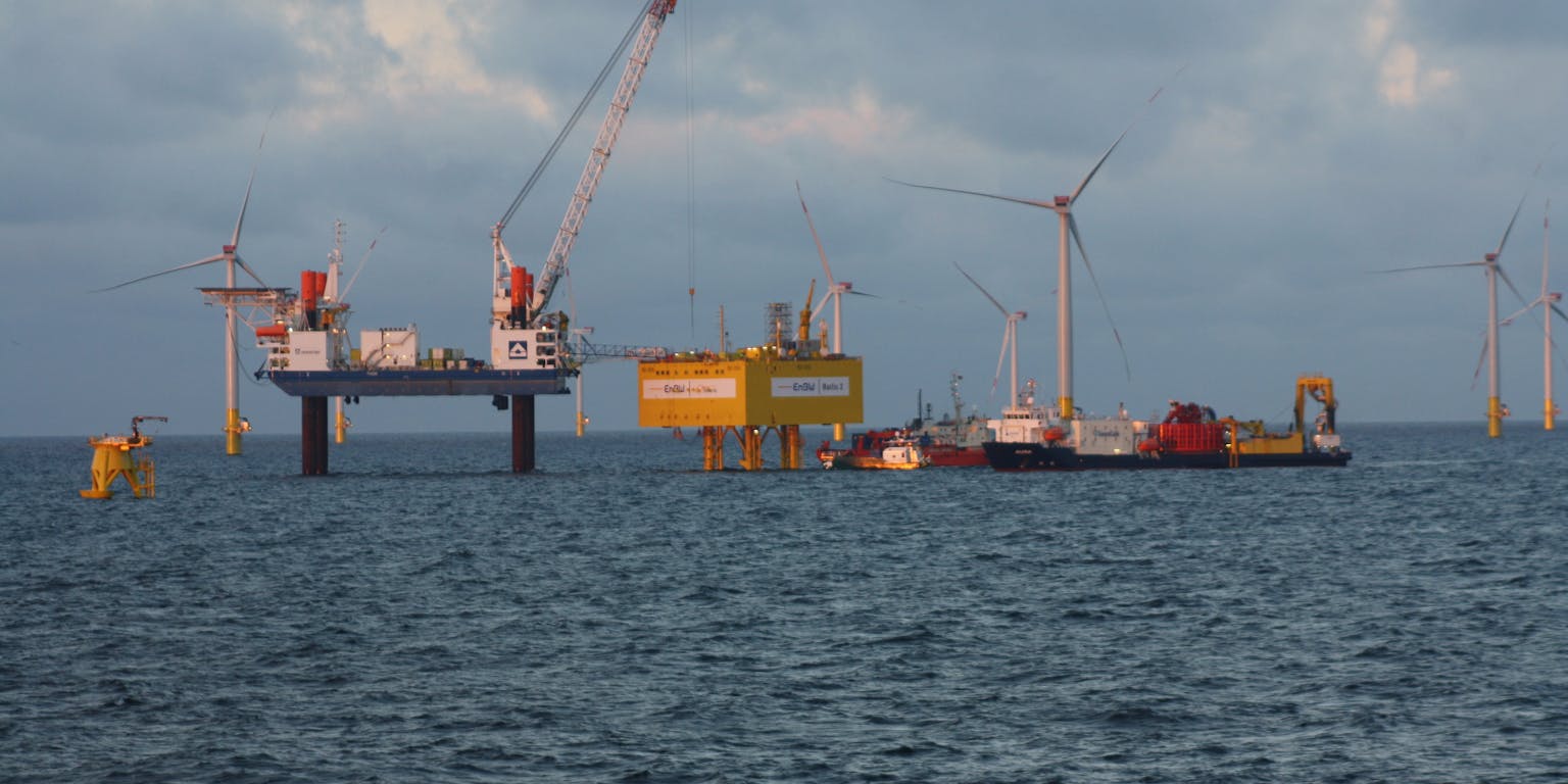Windpark Baltic 2 tijdens de bouw in 2013, vlakbij de Deense territoriale wateren, wordt met het Deense windpark Kriegers Flak verbonden.